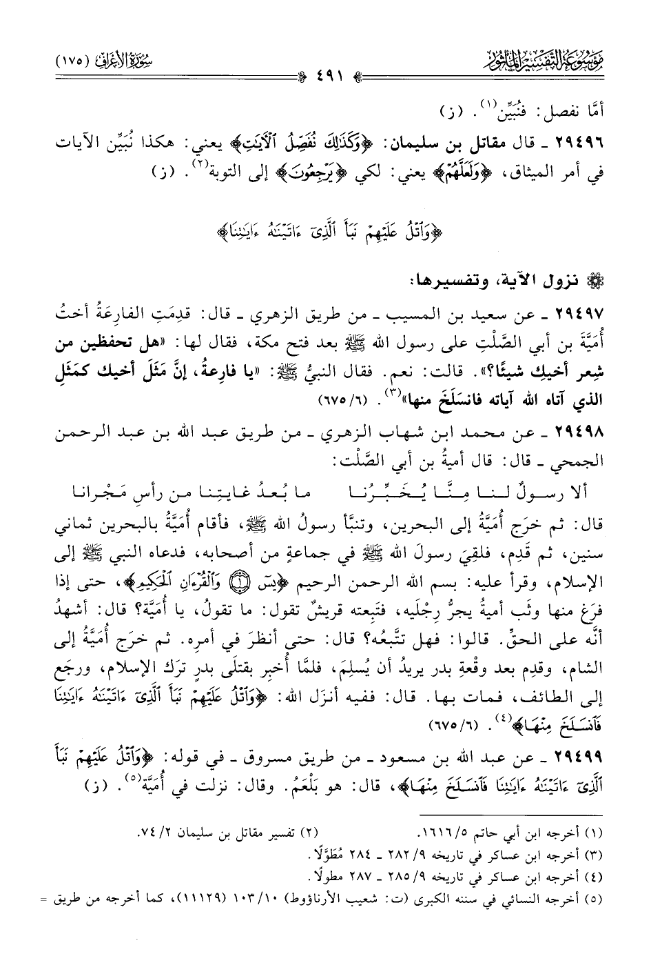 (¬٥) أخرجه النسائي في سننه الكبرى (ت: شعيب الأرناؤوط) ١٠/ ١٠٣ (١١١٢٩)، كما أخرجه من طريق نافع بن عاصم رقم (١١١٢٨) بلفظ: نزلت في أمية، وأخرجه الحاكم (ت: مصطفى عطا) ٢/ ٣٥٦ (٣٢٥٨/ ٣٧٥) عنه أنّه بلعم، وابن أبي حاتم ٥/ ١٦١٦.