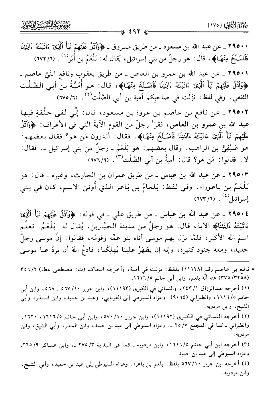٢٩٥٠٢ - عن نافع بن عاصم بن عروة بن مسعود، قال: إنِّي لفي حلْقةٍ فيها عبد الله بن عمرو بن العاص، فقرَأ رجلٌ من القوم الآيةَ التي في الأعراف: {واتل عليهم نبأ الذي آتيناه آياتنا فانسلخ منها}. فقال: أتدرون مَن هو؟ فقال بعضهم: هو صَيْفِيُّ بن الراهب. وقال بعضهم: هو بَلْعَمُ -رجلٌ من بني إسرائيل-. فقال: لا. فقالوا: مَن هو؟ قال: أميةُ بن أبي الصَّلْت (¬٣). (٦/ ٦٧٦)