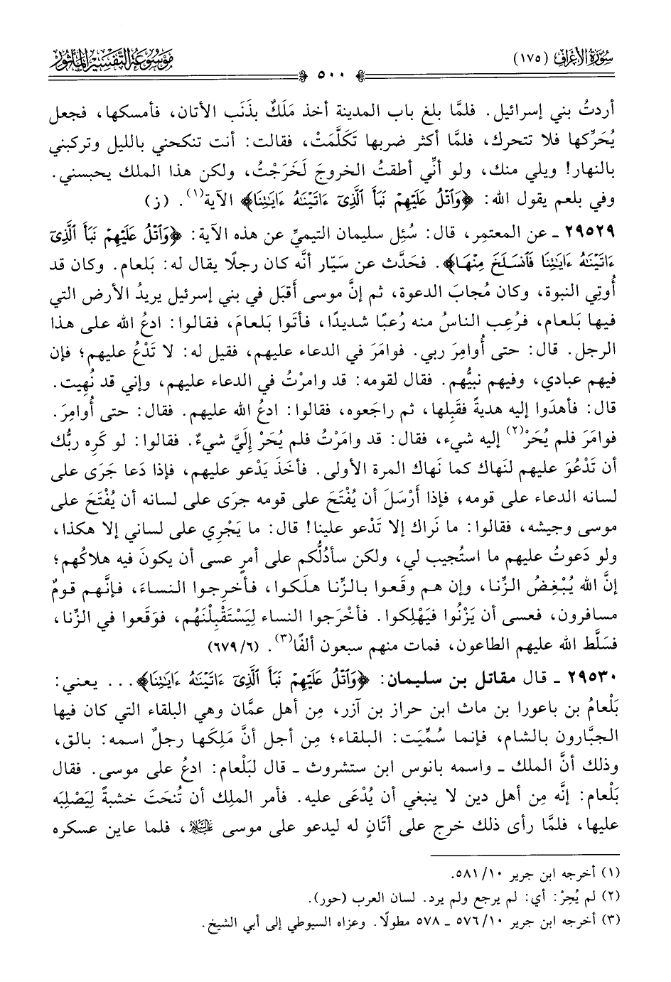٢٩٥٣٠ - قال مقاتل بن سليمان: {واتل عليهم نبأ الذي آتيناه آياتنا} ... يعني: بَلْعامُ بن باعورا بن ماث ابن حراز بن آزر، مِن أهل عمّان وهي البلقاء التي كان فيها الجبّارون بالشام، فإنما سُمِّيَت: البلقاء؛ مِن أجل أنّ مَلِكَها رجلٌ اسمه: بالق، وذلك أنّ الملك -واسمه بانوس ابن ستشروث- قال لبَلْعام: ادعُ على موسى. فقال بَلْعام: إنّه مِن أهل دين لا ينبغي أن يُدْعى عليه. فأمر الملِك أن تُنحَتَ خشبةً لِيَصْلِبَه عليها، فلمّا رأى ذلك خرج على أتًانٍ له ليدعو على موسى - عليه السلام -، فلما عاين عسكره