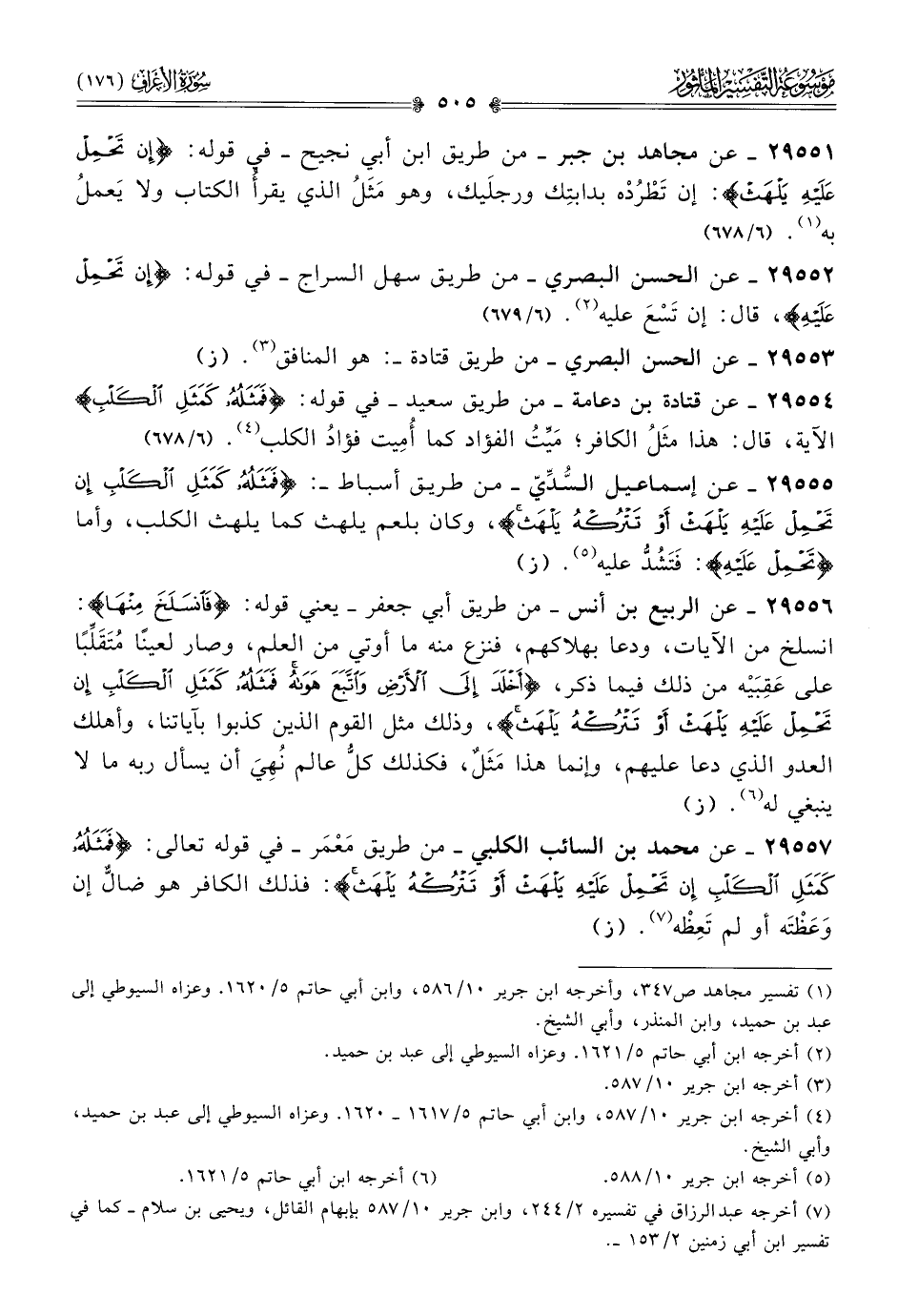 ٢٩٥٥١ - عن مجاهد بن جبر -من طريق ابن أبي نجيح- في قوله: {إن تحمل عليه يلهث}: إن تَطْرُدْه بدابتِك ورجلَيك، وهو مَثَلُ الذي يقرأُ الكتاب ولا يَعملُ به (¬١). (٦/ ٦٧٨)