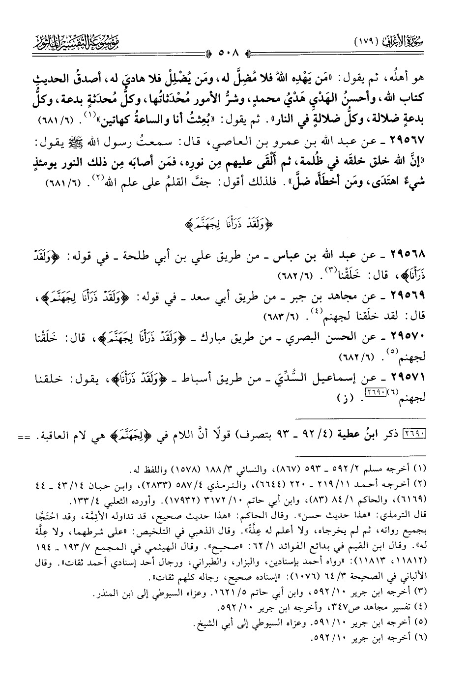 ٢٩٥٧٠ - عن الحسن البصري -من طريق مبارك- {ولقد ذرأنا لجهنم}، قال: خَلَقْنا لجهنم (¬٥). (٦/ ٦٨٢)