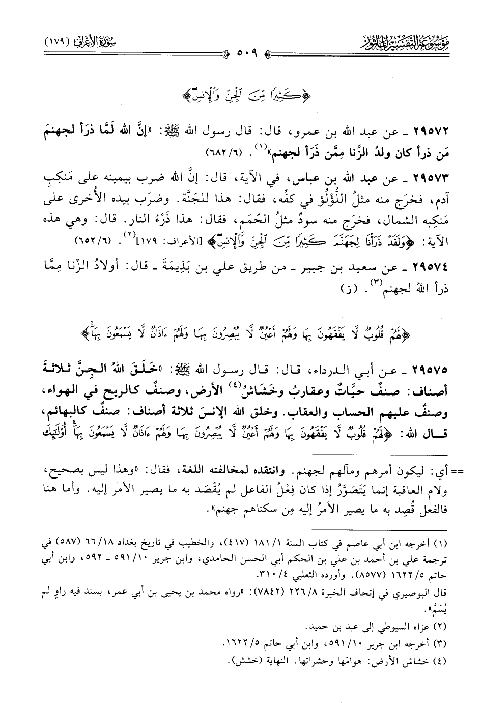 ٢٩٥٧٥ - عن أبي الدرداء، قال: قال رسول الله - صلى الله عليه وسلم -: «خَلَقَ اللهُ الجِنَّ ثلاثةَ أصناف: صنفٌ حيّاتٌ وعقاربُ وخَشاشُ (¬٤) الأرض، وصنفٌ كالريح في الهواء، وصنفٌ عليهم الحساب والعقاب. وخلق الله الإنسَ ثلاثة أصناف: صنفٌ كالبهائم، قال الله: {لهم قلوب لا يفقهون بها ولهم أعين لا يبصرون بها ولهم آذان لا يسمعون بها أولئك
