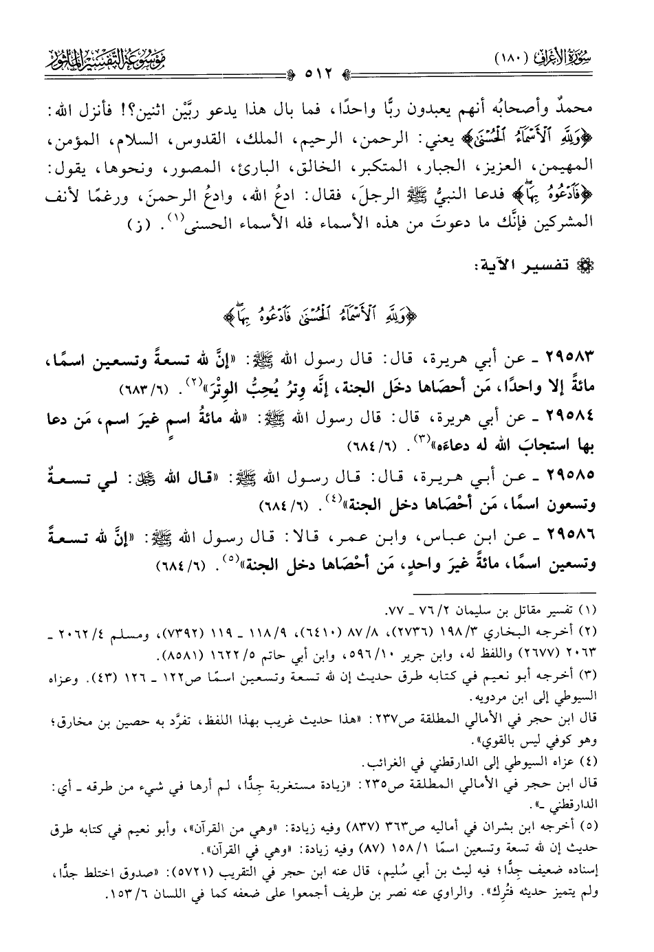 (¬٣) أخرجه أبو نعيم في كتابه طرق حديث إن لله تسعة وتسعين اسمًا ص ١٢٢ - ١٢٦ (٤٣). وعزاه السيوطي إلى ابن مردويه.