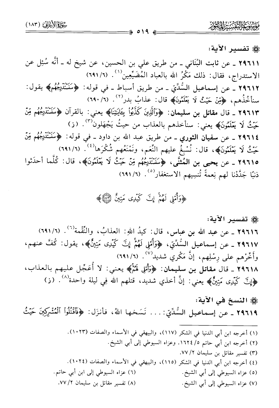 ٢٩٦١٢ - عن إسماعيل السُّدِّيّ -من طريق أسباط- في قوله: {سنستدرجهم} يقول: سنأخُذُهم، {من حيث لا يعلمون} قال: عذابُ بدر (¬٢). (٦/ ٦٩٠)