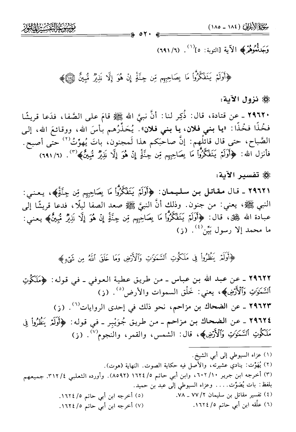 ٢٩٦٢٠ - عن قتادة، قال: ذُكِر لنا: أنّ نبيَّ الله - صلى الله عليه وسلم - قامَ على الصَّفا، فدَعا قريشًا فخْذًا فخْذًا: «يا بني فلان، يا بني فلان». يُحَذِّرُهم بأسَ الله، ووقائعَ الله، إلى الصَّباح، حتى قال قائلُهم: إنّ صاحبَكم هذا لَمجنون، باتَ يُهوِّتُ (¬٢) حتى أصبح. فأنزل الله: {أولم يتفكروا ما بصاحبهم من جنة إن هو إلا نذير مبين} (¬٣). (٦/ ٦٩١)