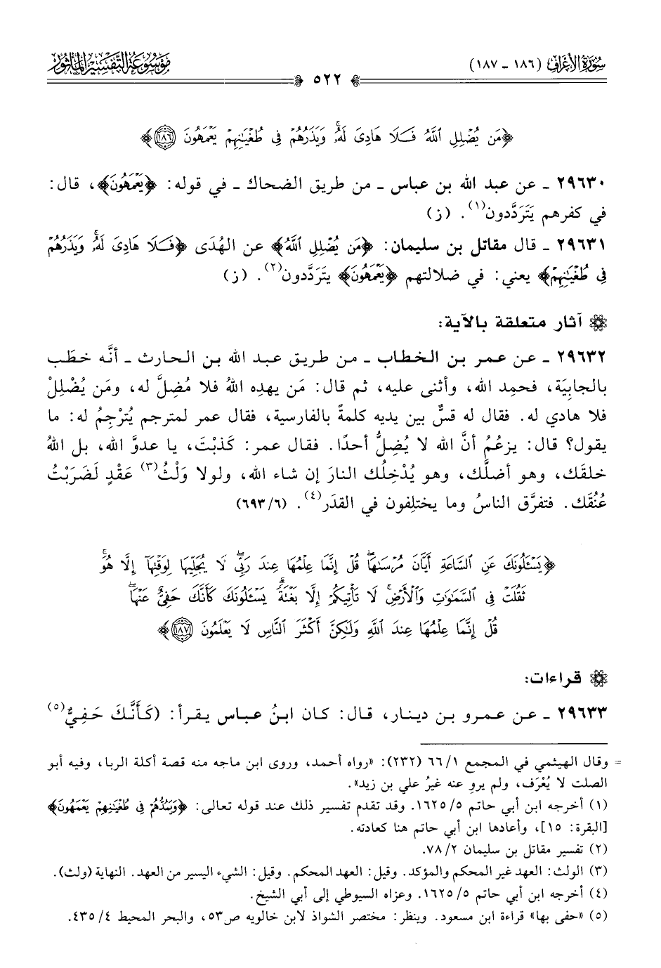 ٢٩٦٣١ - قال مقاتل بن سليمان: {مَن يُضْلِلِ اللَّهُ} عن الهُدى {فَلا هادِيَ لَهُ ويَذَرُهُمْ فِي طُغْيانِهِمْ} يعني: في ضلالتهم {يَعْمَهُونَ} يتَرَدَّدون (¬٢). (ز)