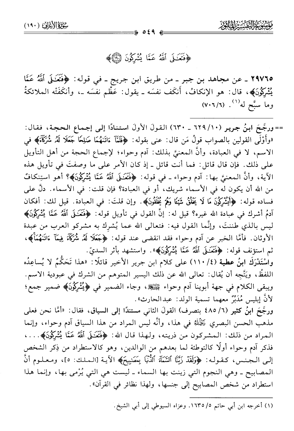 ٢٩٧٦٥ - عن مجاهد بن جبر -من طريق ابن جريج- في قوله: {فتعالى الله عما يشركون}، قال: هو الإنكافُ، أنكَف نفسَه -يقول: عَظَّم نفسَه-، وأنكَفَتْه الملائكةُ وما سبَّح له (¬١). (٦/ ٧٠٦)