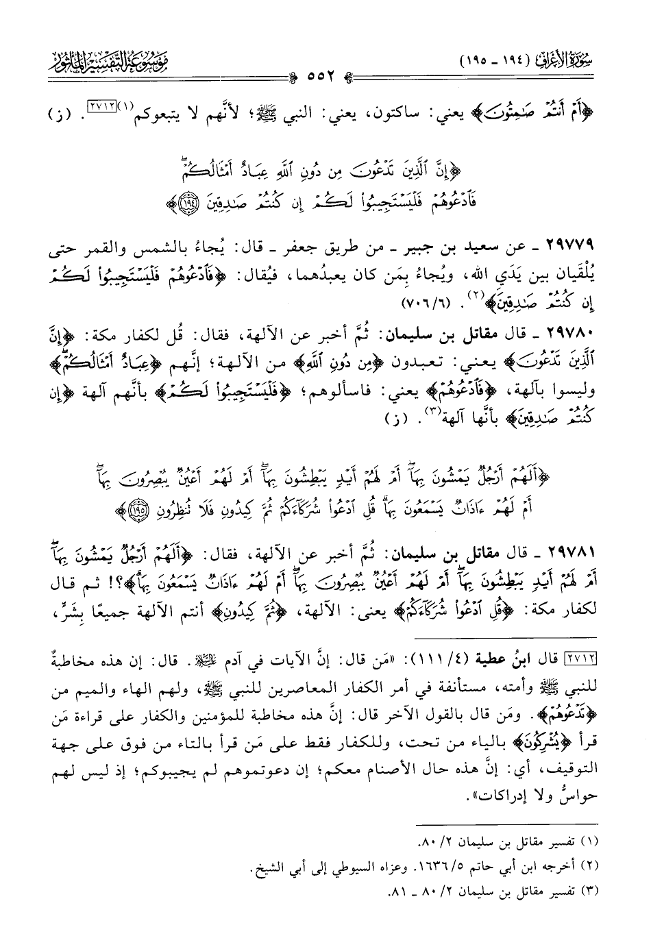 [٢٧١٢] قال ابنُ عطية (٤/ ١١١): «مَن قال: إنّ الآيات في آدم - عليه السلام -. قال: إن هذه مخاطبةٌ للنبي - صلى الله عليه وسلم - وأمته، مستأنفة في أمر الكفار المعاصرين للنبي - صلى الله عليه وسلم -، ولهم الهاء والميم من {تدعوهم}. ومَن قال بالقول الآخر قال: إنّ هذه مخاطبة للمؤمنين والكفار على قراءة مَن قرأ {يشركون} بالياء من تحت، وللكفار فقط على مَن قرأ بالتاء من فوق على جهة التوقيف، أي: إنّ هذه حال الأصنام معكم؛ إن دعوتموهم لم يجيبوكم؛ إذ ليس لهم حواسُّ ولا إدراكات».