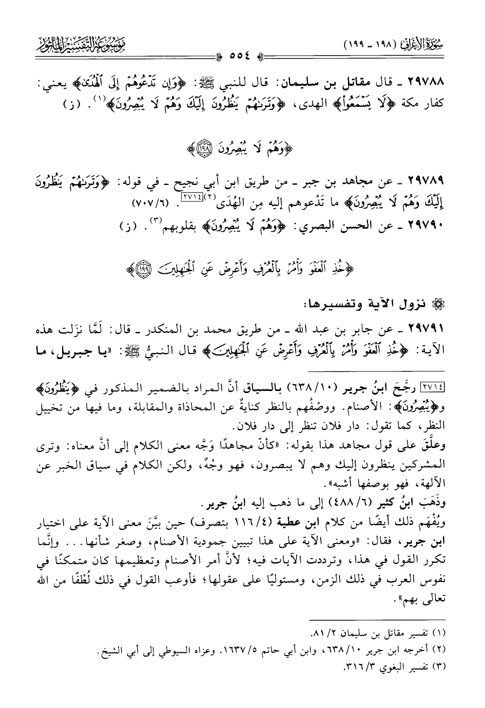 ٢٩٧٨٩ - عن مجاهد بن جبر -من طريق ابن أبي نجيح- في قوله: {وتراهم ينظرون إليك وهم لا يبصرون} ما تَدْعوهم إليه مِن الهُدى (¬٢) [٢٧١٤]. (٦/ ٧٠٦)