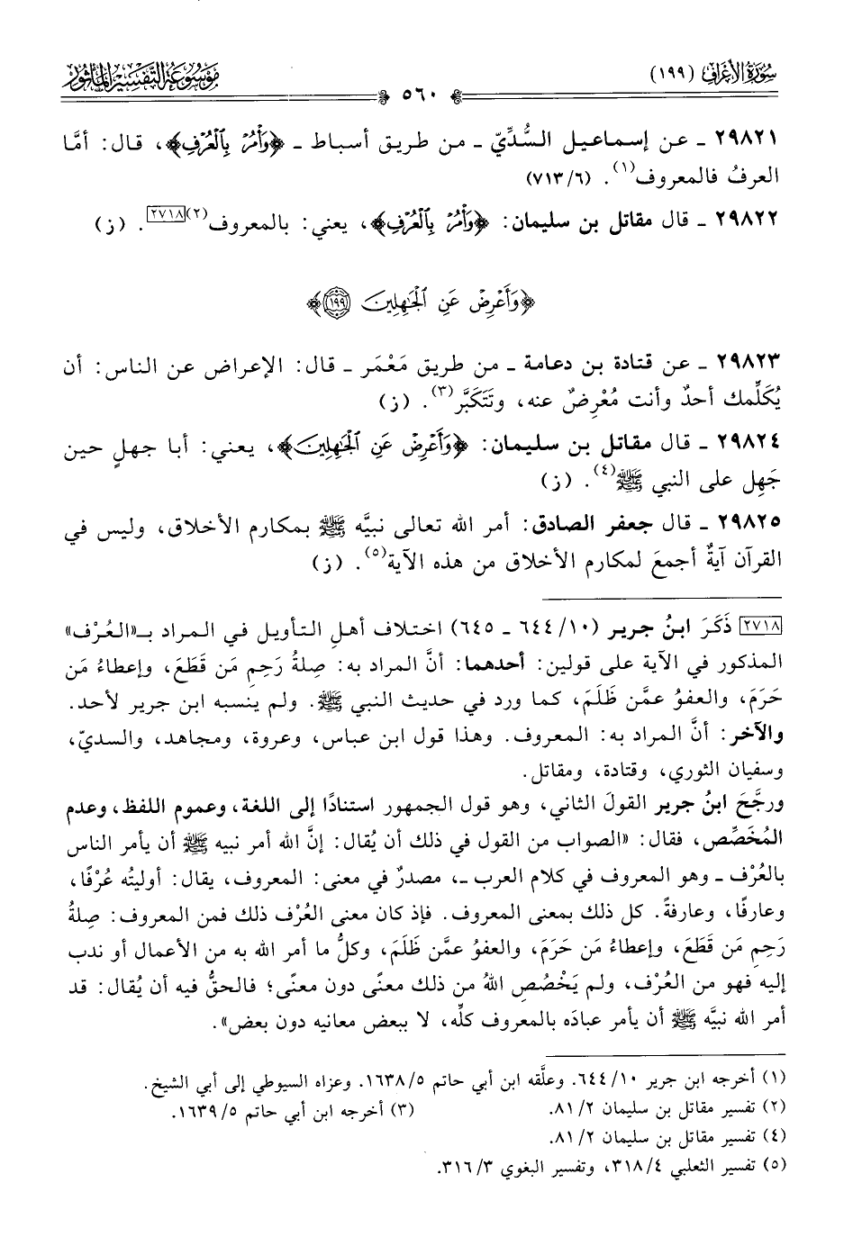 [٢٧١٨] ذَكَرَ ابنُ جرير (١٠/ ٦٤٤ - ٦٤٥) اختلاف أهلِ التأويل في المراد بـ «العُرْف» المذكور في الآية على قولين: أحدهما: أنّ المراد به: صِلةُ رَحِمِ مَن قَطَعَ، وإعطاءُ مَن حَرَمَ، والعفوُ عمَّن ظَلَمَ، كما ورد في حديث النبي - صلى الله عليه وسلم -. ولم ينسبه ابن جرير لأحد. والآخر: أنّ المراد به: المعروف. وهذا قول ابن عباس، وعروة، ومجاهد، والسديّ، وسفيان الثوري، وقتادة، ومقاتل.