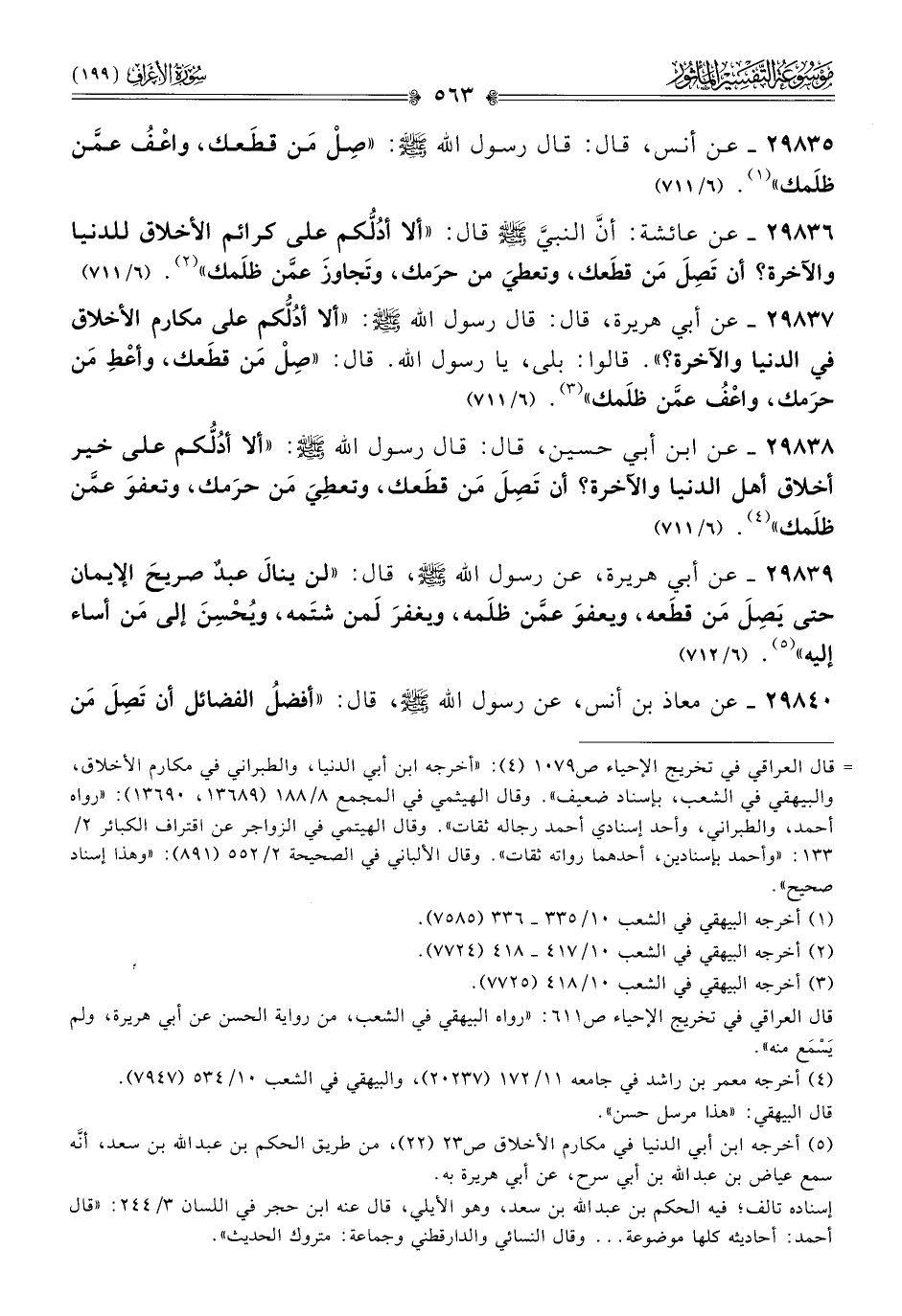 ٢٩٨٣٧ - عن أبي هريرة، قال: قال رسول الله - صلى الله عليه وسلم -: «ألا أدُلُّكم على مكارم الأخلاق في الدنيا والآخرة؟». قالوا: بلى، يا رسول الله. قال: «صِلْ مَن قطَعك، وأعْطِ مَن حرَمك، واعْفُ عمَّن ظلَمك» (¬٣). (٦/ ٧١١)