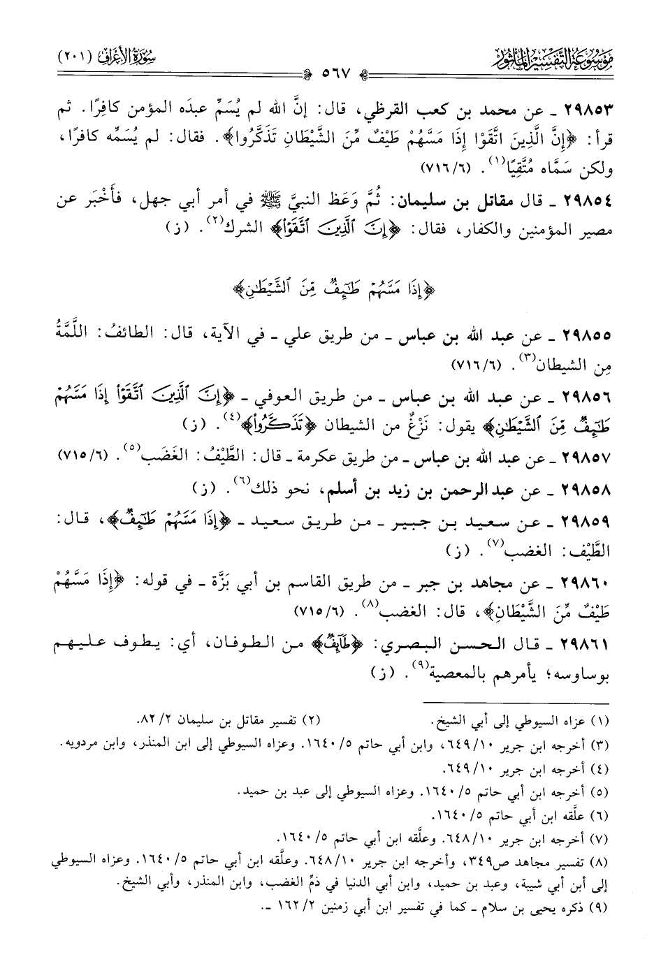 ٢٩٨٦١ - قال الحسن البصري: {طائف} من الطوفان، أي: يطوف عليهم بوساوسه؛ يأمرهم بالمعصية (¬٩). (ز)