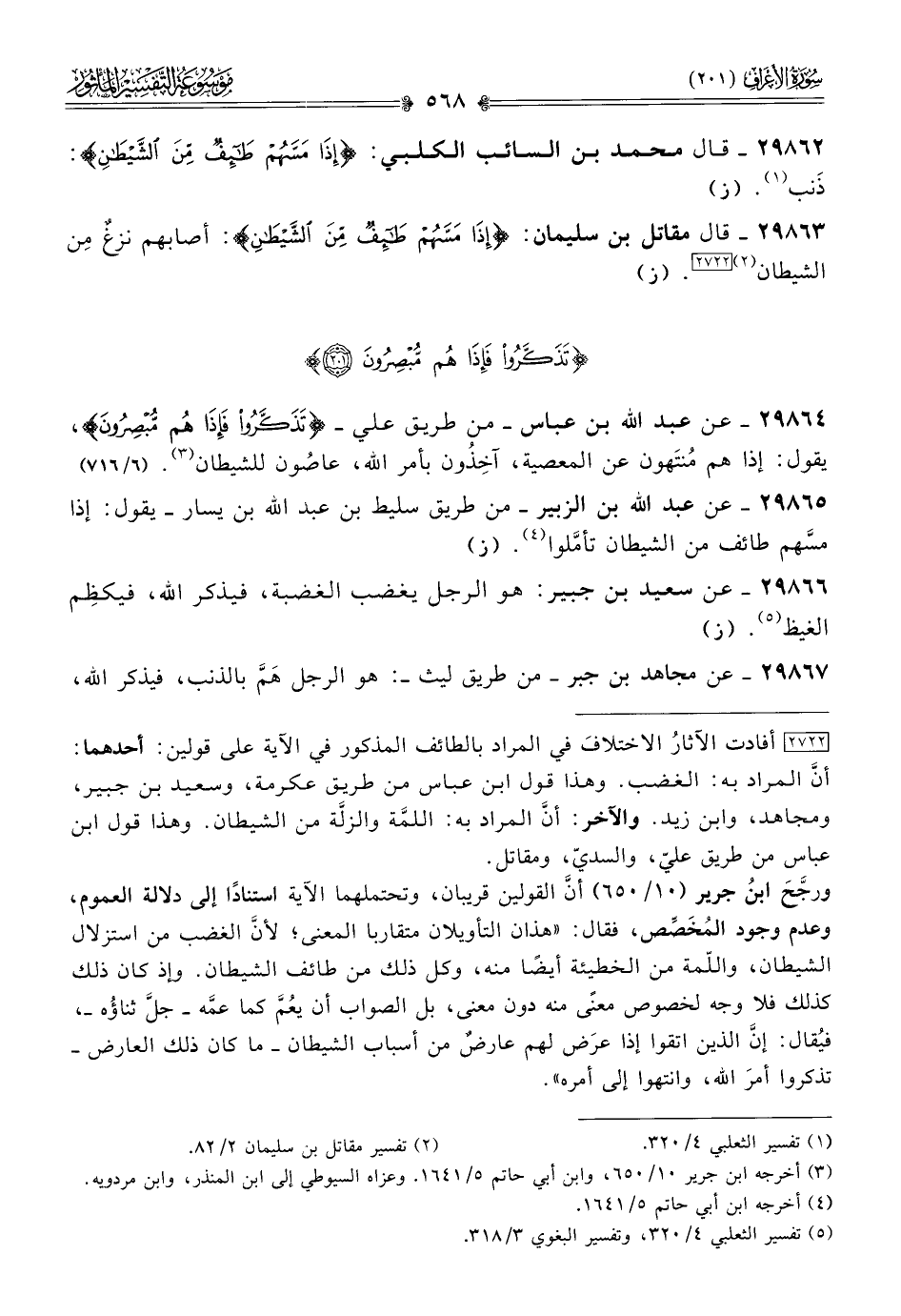 [٢٧٢٢] أفادت الآثارُ الاختلافَ في المراد بالطائف المذكور في الآية على قولين: أحدهما: أنّ المراد به: الغضب. وهذا قول ابن عباس من طريق عكرمة، وسعيد بن جبير، ومجاهد، وابن زيد. والآخر: أنّ المراد به: اللمَّة والزلَّة من الشيطان. وهذا قول ابن عباس من طريق عليّ، والسديّ، ومقاتل.