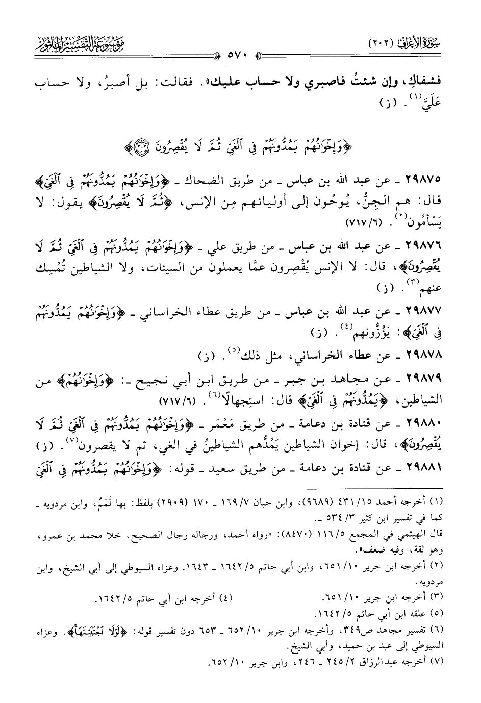 ٢٩٨٧٦ - عن عبد الله بن عباس -من طريق علي- {وإخْوانُهُمْ يَمُدُّونَهُمْ فِي الغَيِّ ثُمَّ لا يُقْصِرُونَ}، قال: لا الإنس يُقْصِرون عمّا يعملون من السيئات، ولا الشياطين تُمْسِك عنهم (¬٣). (ز)