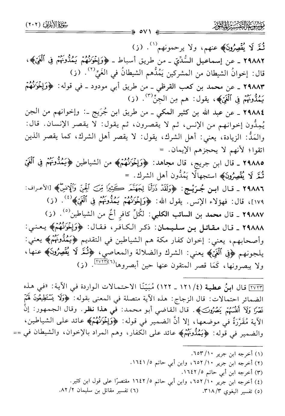 ٢٩٨٨٨ - قال مقاتل بن سليمان: ذكر الكافر، فقال: {وإخْوانُهُمْ} يعني: وأصحابهم، يعني: إخوان كفار مكة هم الشياطين في التقديم {يَمُدُّونَهُمْ} يعني: يلجونهم {فِي الغَيِّ} يعني: الشرك والضلالة والمعاصي، {ثُمَّ لا يُقْصِرُونَ} عنها، ولا يبصرونها، كَما قصر المتقون عنها حين أبصروها (¬٦) [٢٧٢٣]. (ز)