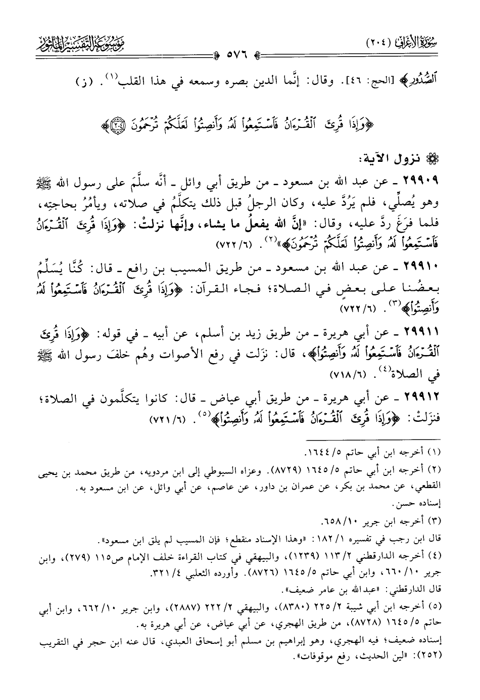 ٢٩٩٠٩ - عن عبد الله بن مسعود -من طريق أبي وائل- أنّه سلَّمَ على رسول الله - صلى الله عليه وسلم - وهو يُصلِّي، فلم يَرُدَّ عليه، وكان الرجلُ قبل ذلك يتكلَّمُ في صلاته، ويأمُرُ بحاجتِه، فلما فرَغَ ردَّ عليه، وقال: «إنّ الله يفعلُ ما يشاء، وإنّها نزلتْ: {وإذا قرئ القرآن فاستمعوا له وأنصتوا لعلكم ترحمون}» (¬٢). (٦/ ٧٢٢)