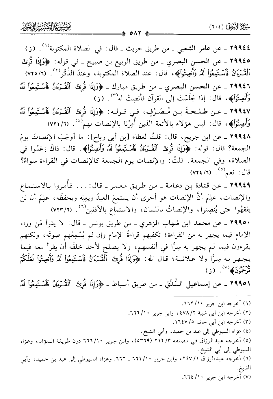 ٢٩٩٤٥ - عن الحسن البصري -من طريق الربيع بن صبيح- في قوله: {وإذا قرئ القرآن فاستمعوا له وأنصتوا}، قال: عند الصلاة المكتوبة، وعندَ الذِّكْر (¬٢). (٦/ ٧٢٥)