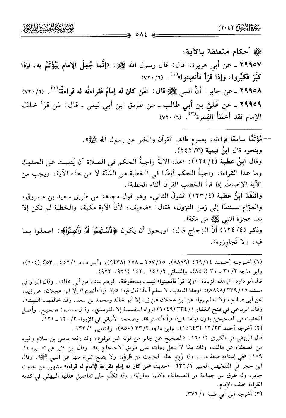 قال أبو داود: «وهذه الزيادة: «وإذا قرأ فأنصتوا» ليست بمحفوظة، الوهم عندنا من أبي خالد». وقال البزار في مسنده ١٥/ ٣٣٩ (٨٨٩٨): «وهذا الحديث لا نعلم أحدًا قال فيه: «فإذا قرأ فأنصتوا» إلا ابن عجلان، عن زيد، عن أبي صالح، ولا نعلم رواه عن ابن عجلان عن زيد إلا أبو خالد ومحمد بن سعد، وقد خالفهما الليث». وقال الرباعي في فتح الغفار ١/ ٣٣٤ (١٠٤٩) «رواه الخمسة إلا الترمذي، وقال مسلم: صحيح. وأصل الحديث في الصحيحين بدون قوله: «وإذا قرأ فأنصتوا»». وصححه الألباني في الإرواء ٢/ ١٢٠ - ١٢١.
