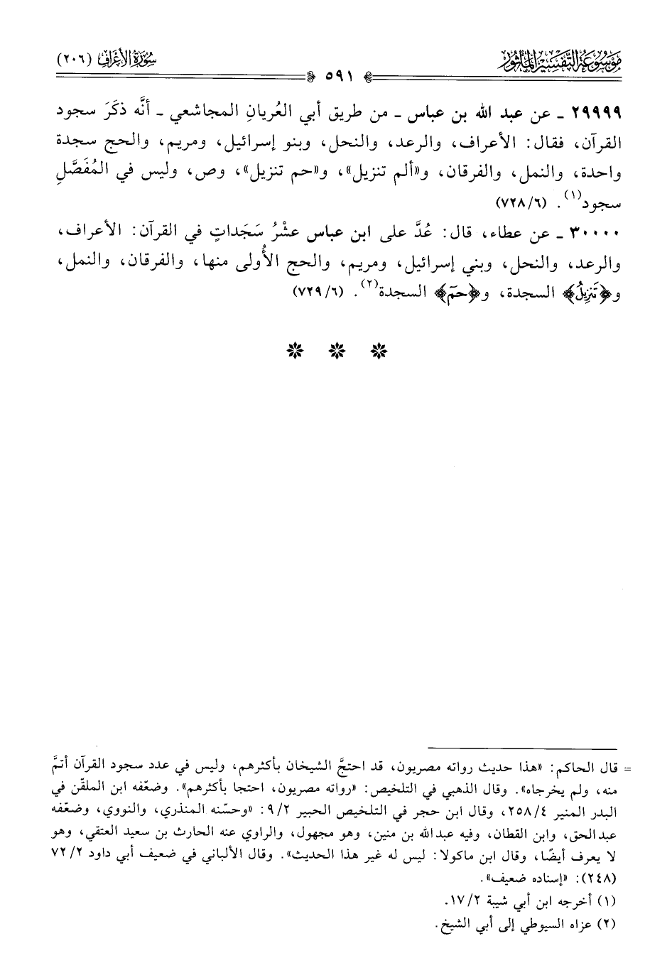٢٩٩٩٩ - عن عبد الله بن عباس -من طريق أبي العُريانِ المجاشعي- أنّه ذكَرَ سجود القرآن، فقال: الأعراف، والرعد، والنحل، وبنو إسرائيل، ومريم، والحج سجدة واحدة، والنمل، والفرقان، و {آلم تنزيل}، و {حم تنزيل}، وص، وليس في المُفَصَّلِ سجود (¬١). (٦/ ٧٢٨)