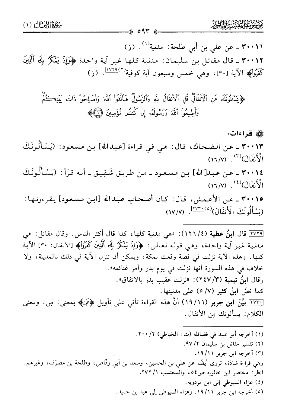 ٣٠٠١٣ - عن الضحاك، قال: هي في قراءة [عبد الله] بن مسعود: (يَسْأَلُونَكَ الأَنفالَ) (¬٣). (٧/ ١٦)