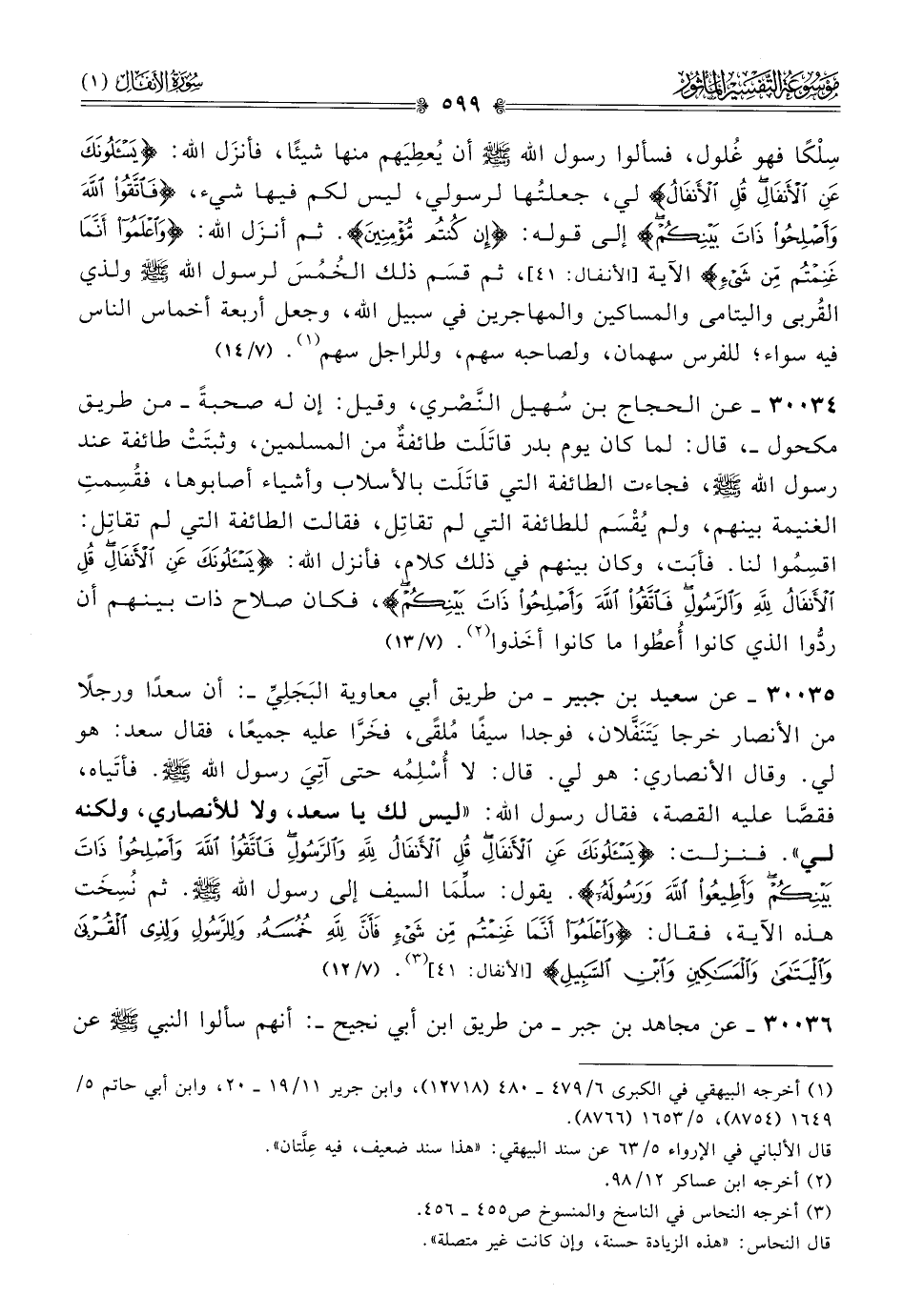٣٠٠٣٥ - عن سعيد بن جبير -من طريق أبي معاوية البَجَلِيِّ-: أن سعدًا ورجلًا من الأنصار خرجا يَتَنَفَّلان، فوجدا سيفًا مُلقًى، فخَرّا عليه جميعًا، فقال سعد: هو لي. وقال الأنصاري: هو لي. قال: لا أُسْلِمُه حتى آتِيَ رسول الله - صلى الله عليه وسلم -. فأتَياه، فقصّا عليه القصة، فقال رسول الله: «ليس لك يا سعد، ولا للأنصاري، ولكنه لي». فنزلت: {يسألونك عن الأنفال قل الأنفال لله والرسول فاتقوا الله وأصلحوا ذات بينكم وأطيعوا الله ورسوله}. يقول: سلِّما السيف إلى رسول الله - صلى الله عليه وسلم -. ثم نُسِخَت هذه الآية، فقال: {واعلموا أنما غنمتم من شيء فأن لله خمسه وللرسول ولذي القربى واليتامى والمساكين وابن السبيل} [الأنفال: ٤١] (¬٣). (٧/ ١٢)
