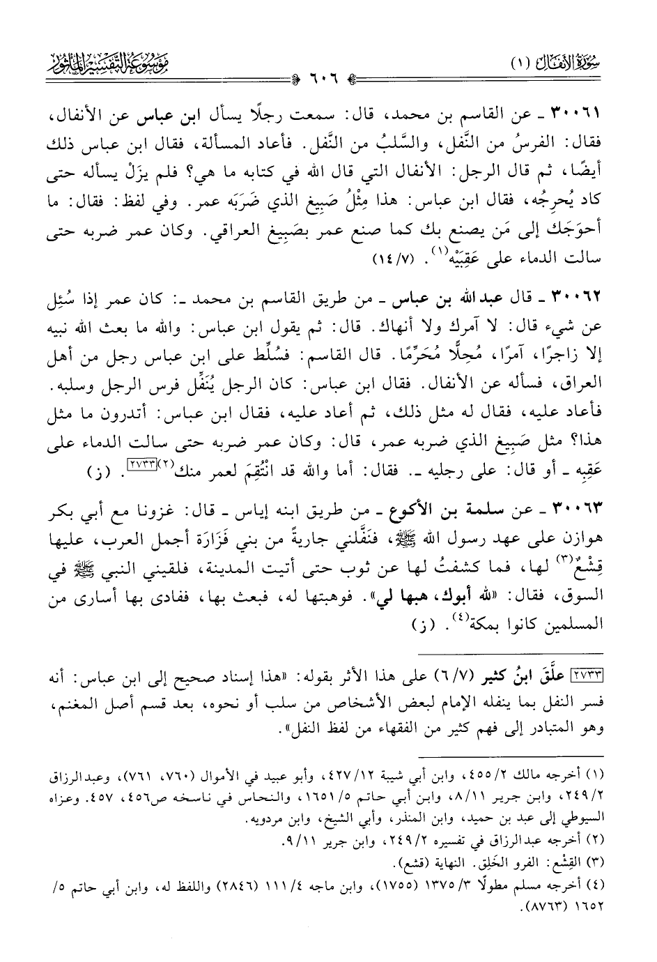 [٢٧٣٣] علَّقَ ابنُ كثير (٧/ ٦) على هذا الأثر بقوله: «هذا إسناد صحيح إلى ابن عباس: أنه فسر النفل بما ينفله الإمام لبعض الأشخاص من سلب أو نحوه، بعد قسم أصل المغنم، وهو المتبادر إلى فهم كثير من الفقهاء من لفظ النفل».
