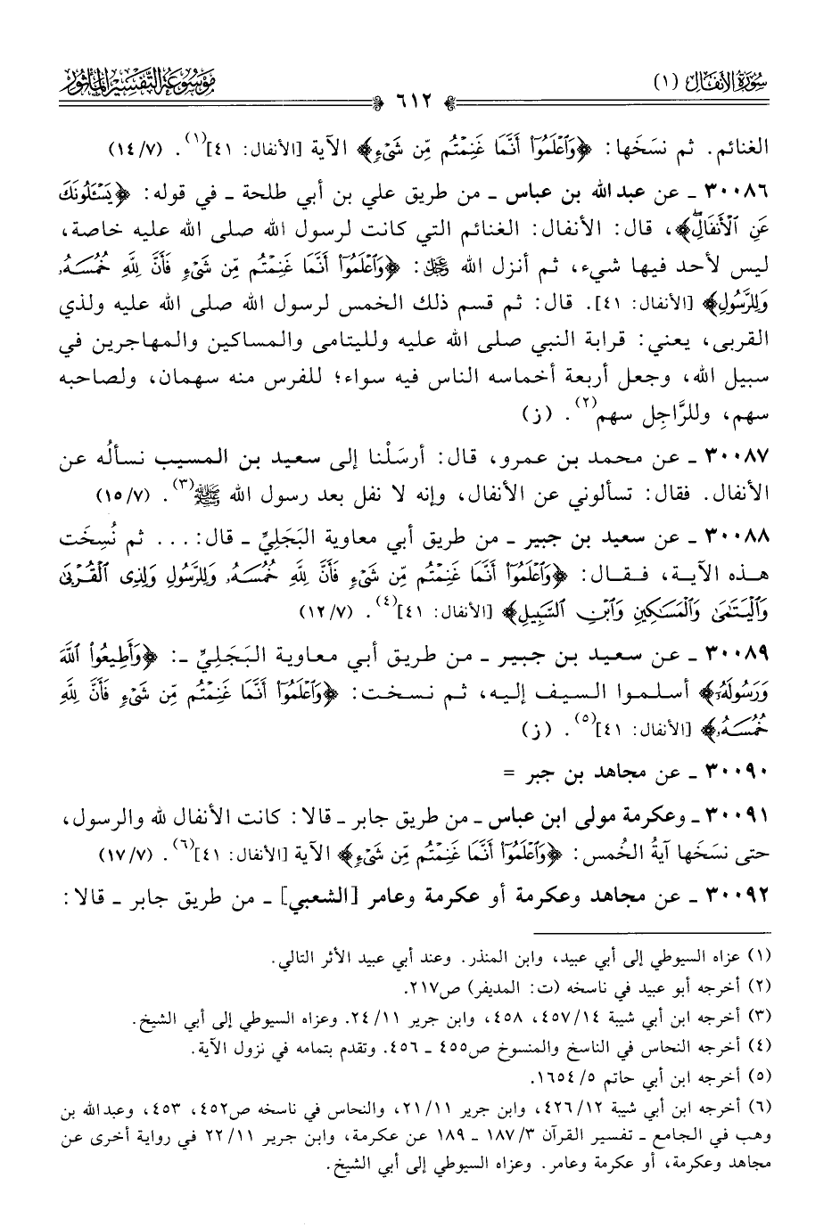 ٣٠٠٩١ - وعكرمة مولى ابن عباس -من طريق جابر- قالا: كانت الأنفال لله والرسول، حتى نسَخَها آيةُ الخُمس: {واعلموا أنما غنمتم من شيء} الآية [الأنفال: ٤١] (¬٦). (٧/ ١٧)