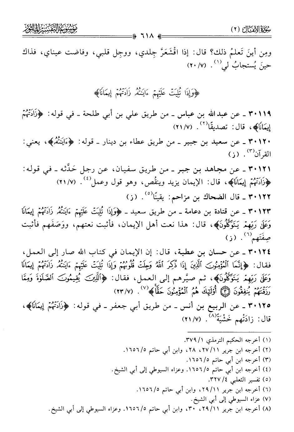 ٣٠١٢٣ - عن قتادة بن دعامة -من طريق سعيد- {وإذا تليت عليهم آياته زادتهم إيمانا وعلى ربهم يتوكلون}، قال: هذا نعت أهل الإيمان، فأثبت نعتهم، ووَصَفَهم فأثبت صِفَتَهم (¬٦). (ز)