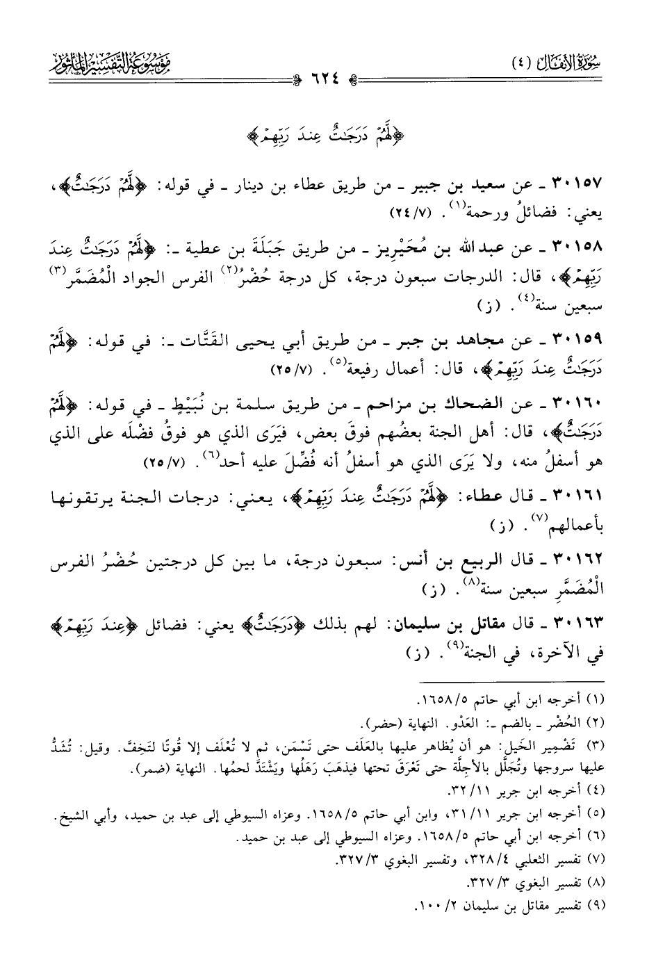 ٣٠١٥٨ - عن عبد الله بن مُحَيْرِيز -من طريق جَبَلَةَ بن عطية-: {لهم درجات عند ربهم}، قال: الدرجات سبعون درجة، كل درجة حُضْرُ (¬٢) الفرس الجواد المُضَمَّر (¬٣) سبعين سنة (¬٤). (ز)