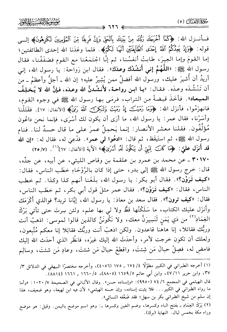 فأنزل الله: {كما أخرجك ربك من بيتك بالحق وإن فريقا من المؤمنين لكارهون} إلى قوله: {وإذ يعدكم الله إحدى الطائفتين أنها لكم}. فلما وعَدَنا الله إحدى الطائفتين؛ إما القومَ وإما العِيرَ، طابتْ أنفسُنا، ثم إنّا اجْتَمَعْنا مع القوم فصَفَفْنا، فقال رسول الله - صلى الله عليه وسلم -: «اللهم إني أنشُدُك وعدَك». فقال ابن رَواحة: يا رسول الله، إني أريدُ أن أُشيرَ عليك، ورسول الله أفضلُ ممن يُشِيرُ عليه؛ إن الله -أجلُّ وأعظمُ- من أن تَنْشُدَه وعدَه. فقال: «يا ابن رواحة، لأَنشُدنَّ الله وعدَه، فإنّ الله لا يُخلِفُ الميعاد». فأخَذَ قبضةً من التراب، فرمى بها رسول الله - صلى الله عليه وسلم - في وجوه القوم، فانهزَمُوا، فأنزَل الله: {وما رميت إذ رميت ولكن الله رمى} [الأنفال: ١٧]. فقَتَلْنا وأسَرْنا، فقال عمر: يا رسول الله، ما أرى أن يكون لك أسْرى، فإنما نحن داعُون مُؤَلِّفُون. فقلنا معشر الأنصار: إنما يَحمِلُ عمرَ على ما قال حسدٌ لنا. فنام رسول الله - صلى الله عليه وسلم -، ثم استَيقَظ، ثم قال: «ادعُوا لي عمر». فدُعِيَ له، فقال له: «إن الله قد أنزَل عليَّ: {ما كان لنبي أن يكون له أسرى}» الآية [الأنفال: ٦٧] (¬١). (٧/ ٢٥)