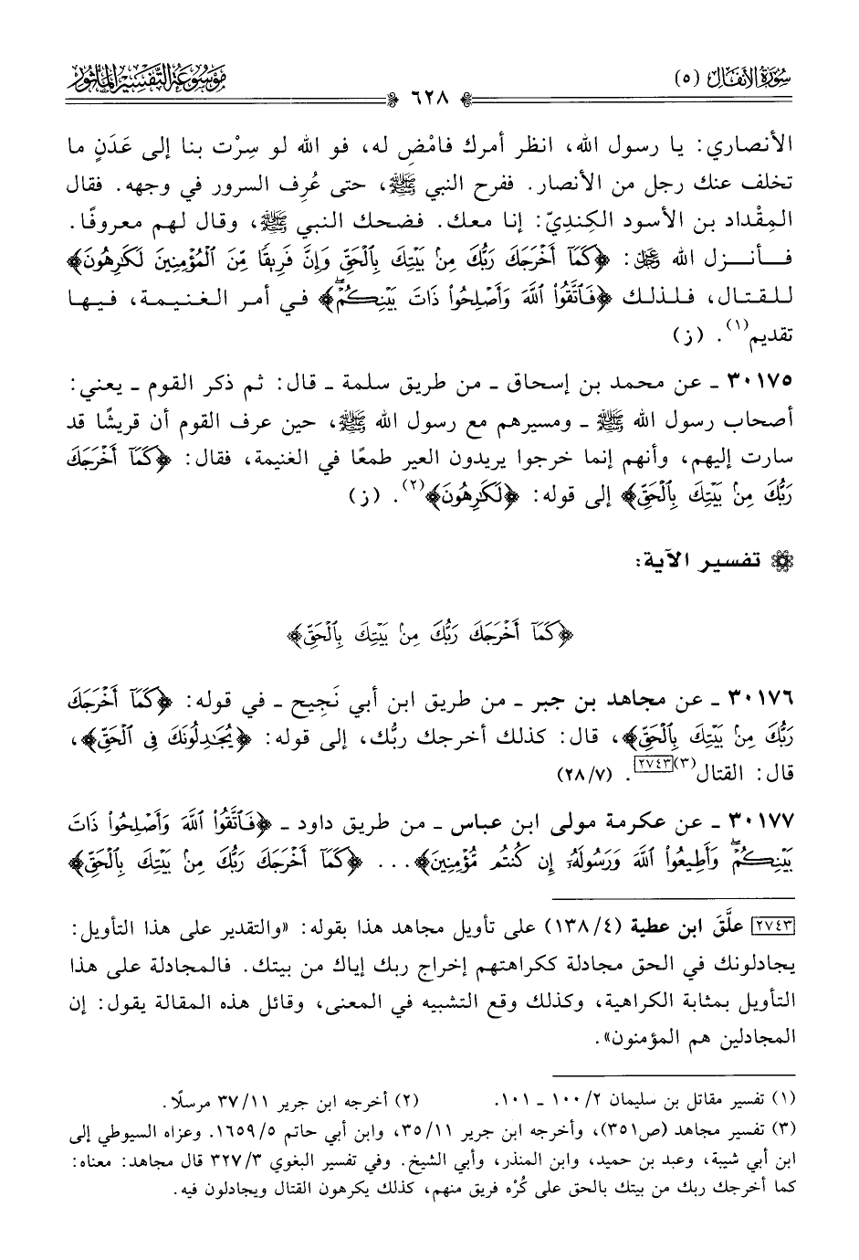 (¬٣) تفسير مجاهد (ص ٣٥١)، وأخرجه ابن جرير ١١/ ٣٥، وابن أبي حاتم ٥/ ١٦٥٩. وعزاه السيوطي إلى ابن أبي شيبة، وعبد بن حميد، وابن المنذر، وأبي الشيخ. وفي تفسير البغوي ٣/ ٣٢٧ قال مجاهد: معناه: كما أخرجك ربك من بيتك بالحق على كُرْه فريق منهم، كذلك يكرهون القتال ويجادلون فيه.