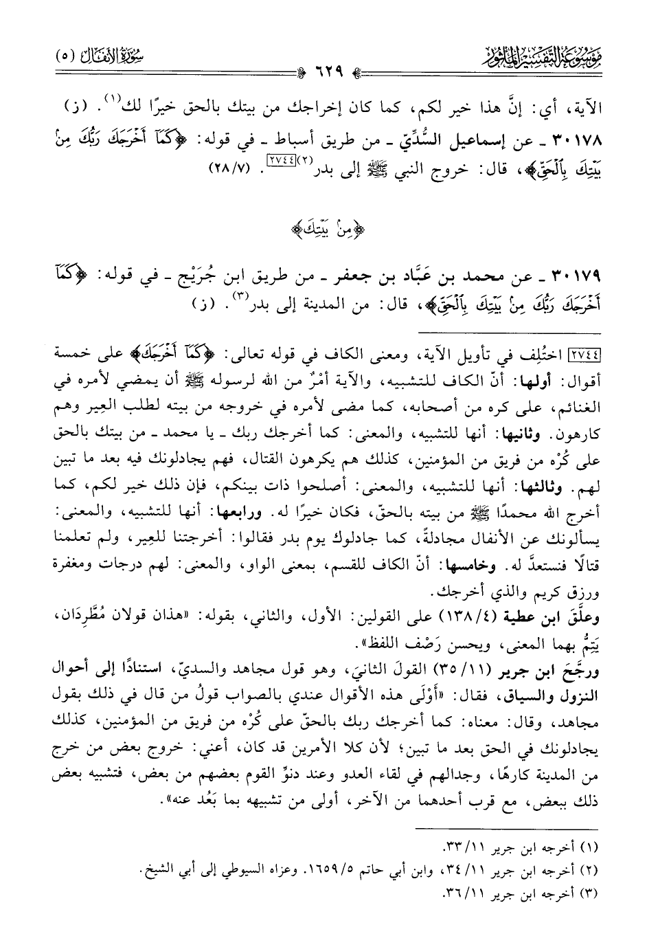 ٣٠١٧٩ - عن محمد بن عَبّاد بن جعفر -من طريق ابن جُرَيْج- في قوله: {كما أخرجك ربك من بيتك بالحق}، قال: من المدينة إلى بدر (¬٣). (ز)
