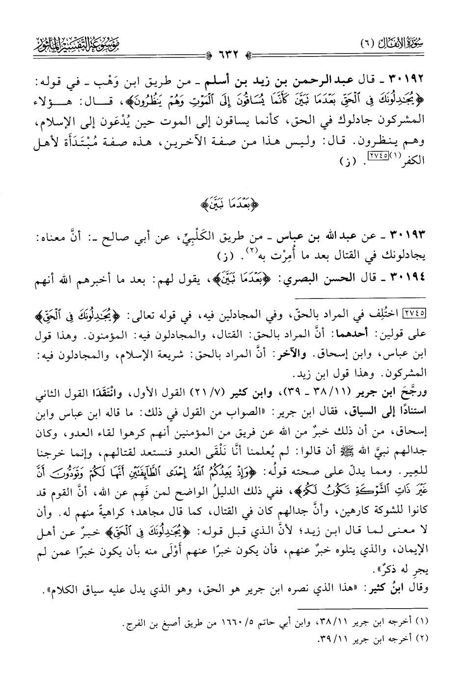٣٠١٩٣ - عن عبد الله بن عباس -من طريق الكَلْبِيِّ، عن أبي صالح-: أنّ معناه: يجادلونك في القتال بعد ما أُمِرْت به (¬٢). (ز)