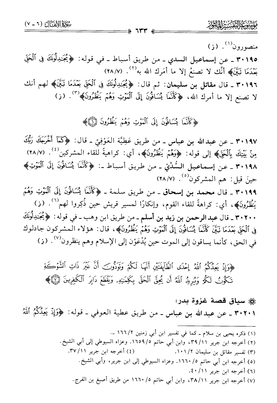 ٣٠١٩٨ - عن إسماعيل السُّدِّيّ -من طريق أسباط-: {كأنما يساقون إلى الموت} حينَ قيل: هم المشركون (¬٥). (٧/ ٢٨)