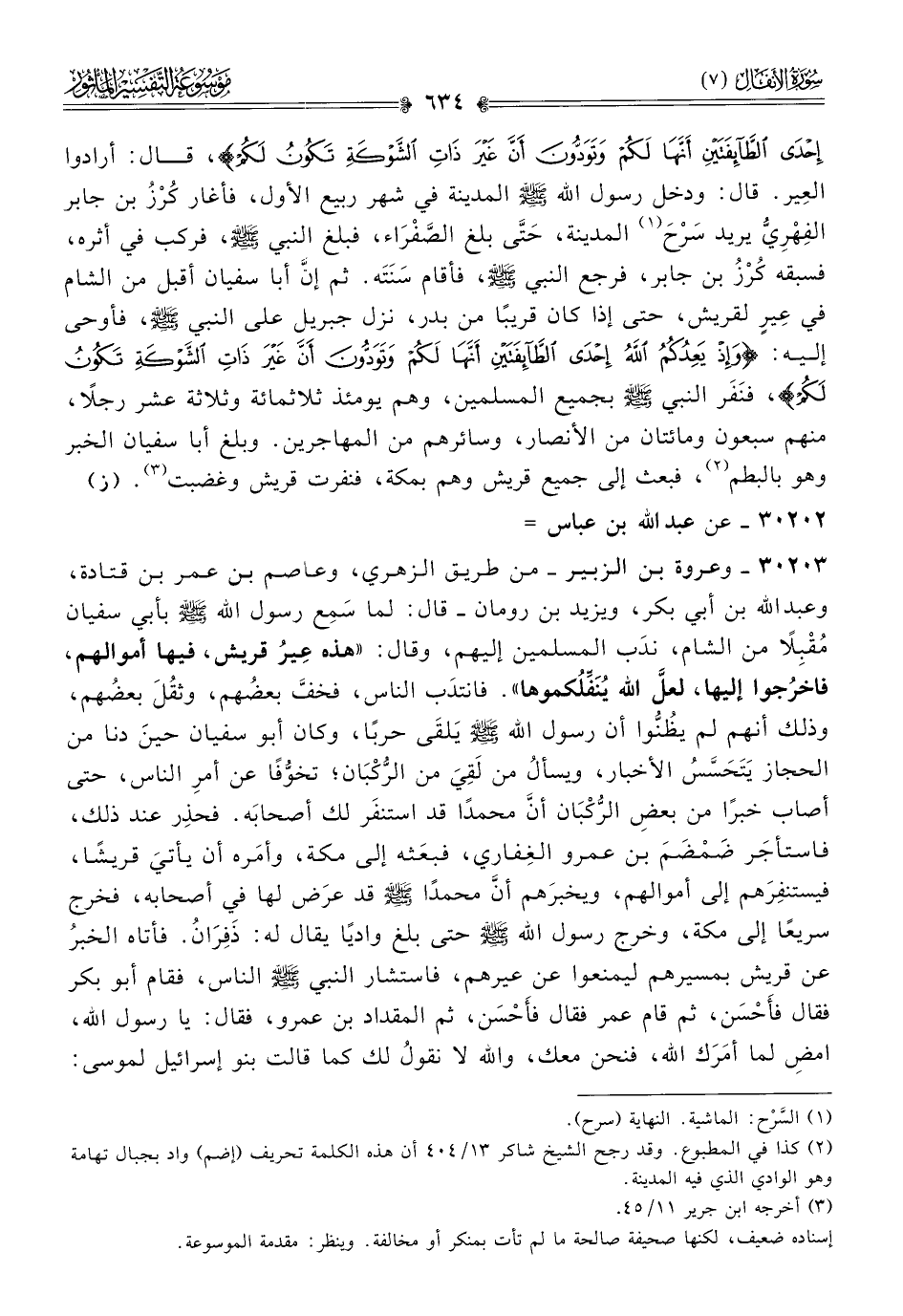 إحدى الطائفتين أنها لكم وتودون أن غير ذات الشوكة تكون لكم}، قال: أرادوا العِير. قال: ودخل رسول الله - صلى الله عليه وسلم - المدينة في شهر ربيع الأول، فأغار كُرْزُ بن جابر الفِهْرِيُّ يريد سَرْحَ (¬١) المدينة، حَتّى بلغ الصَّفْراء، فبلغ النبي - صلى الله عليه وسلم -، فركب في أثره، فسبقه كُرْزُ بن جابر، فرجع النبي - صلى الله عليه وسلم -، فأقام سَنَتَه. ثم إنّ أبا سفيان أقبل من الشام في عِيرٍ لقريش، حتى إذا كان قريبًا من بدر، نزل جبريل على النبي - صلى الله عليه وسلم -، فأوحى إليه: {وإذ يعدكم الله إحدى الطائفتين أنها لكم وتودون أن غير ذات الشوكة تكون لكم}، فنَفَر النبي - صلى الله عليه وسلم - بجميع المسلمين، وهم يومئذ ثلاثمائة وثلاثة عشر رجلًا، منهم سبعون ومائتان من الأنصار، وسائرهم من المهاجرين. وبلغ أبا سفيان الخبر وهو بالبطم (¬٢)، فبعث إلى جميع قريش وهم بمكة، فنفرت قريش وغضبت (¬٣). (ز)
