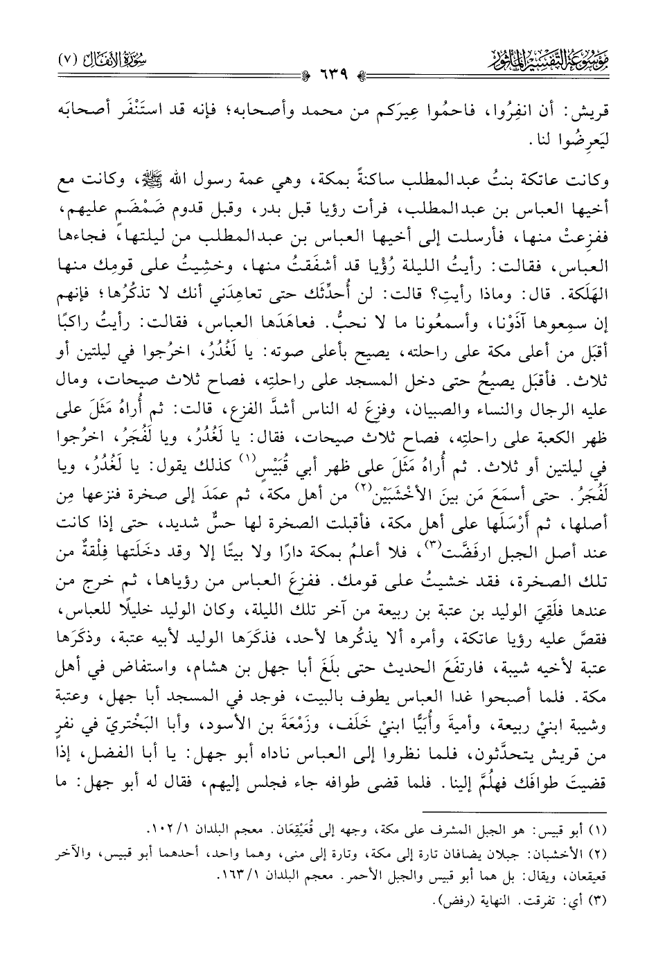 وكانت عاتكة بنتُ عبد المطلب ساكنةً بمكة، وهي عمة رسول الله - صلى الله عليه وسلم -، وكانت مع أخيها العباس بن عبد المطلب، فرأت رؤيا قبل بدر، وقبل قدوم ضَمْضَمٍ عليهم، ففزِعتْ منها، فأرسلت إلى أخيها العباس بن عبد المطلب من ليلتها، فجاءها العباس، فقالت: رأيتُ الليلة رُؤْيا قد أشفَقتُ منها، وخشِيتُ على قومِك منها الهَلَكة. قال: وماذا رأيتِ؟ قالت: لن أُحدِّثَك حتى تعاهِدَني أنك لا تذكُرُها؛ فإنهم إن سمِعوها آذَوْنا، وأسمعُونا ما لا نحبُّ. فعاهَدَها العباس، فقالت: رأيتُ راكبًا أقبَل من أعلى مكة على راحلته، يصيح بأعلى صوته: يا لَغُدُرُ، اخرُجوا في ليلتين أو ثلاث. فأقبَل يصيحُ حتى دخل المسجد على راحلتِه، فصاح ثلاث صيحات، ومال عليه الرجال والنساء والصبيان، وفزِعَ له الناس أشدَّ الفزع، قالت: ثم أُراهُ مَثَلَ على ظهر الكعبة على راحلتِه، فصاح ثلاث صيحات، فقال: يا لَغُدُرُ، ويا لَفُجَرُ، اخرُجوا في ليلتين أو ثلاث. ثم أُراهُ مَثَلَ على ظهر أبي قُبَيْسٍ (¬١) كذلك يقول: يا لَغُدُرُ، ويا لَفُجَرُ. حتى أسمَعَ مَن بينَ الأخْشَبَيْن (¬٢) من أهل مكة، ثم عمَدَ إلى صخرة فنزعها مِن أصلها، ثم أرْسَلَها على أهل مكة، فأقبلت الصخرة لها حسٌّ شديد، حتى إذا كانت عند أصل الجبل ارفَضَّت (¬٣)، فلا أعلمُ بمكة دارًا ولا بيتًا إلا وقد دخَلَتها فِلْقةٌ من تلك الصخرة، فقد خشيتُ على قومك. ففزِعَ العباس من رؤياها، ثم خرج من عندها فلَقِيَ الوليد بن عتبة بن ربيعة من آخر تلك الليلة، وكان الوليد خليلًا للعباس، فقصَّ عليه رؤيا عاتكة، وأمره ألا يذكُرها لأحد، فذكَرَها الوليد لأبيه عتبة، وذكَرَها عتبة لأخيه شيبة، فارتفَعَ الحديث حتى بلَغَ أبا جهل بن هشام، واستفاض في أهل مكة. فلما أصبحوا غدا العباس يطوف بالبيت، فوجد في المسجد أبا جهل، وعتبة وشيبة ابنيْ ربيعة، وأميةَ وأُبَيًّا ابنيْ خَلَف، وزَمْعَةَ بن الأسود، وأبا البَخْتريّ في نفرٍ من قريش يتحدَّثون، فلما نظروا إلى العباس ناداه أبو جهل: يا أبا الفضل، إذا قضيتَ طوافَك فهلُمَّ إلينا. فلما قضى طوافه جاء فجلس إليهم، فقال له أبو جهل: ما