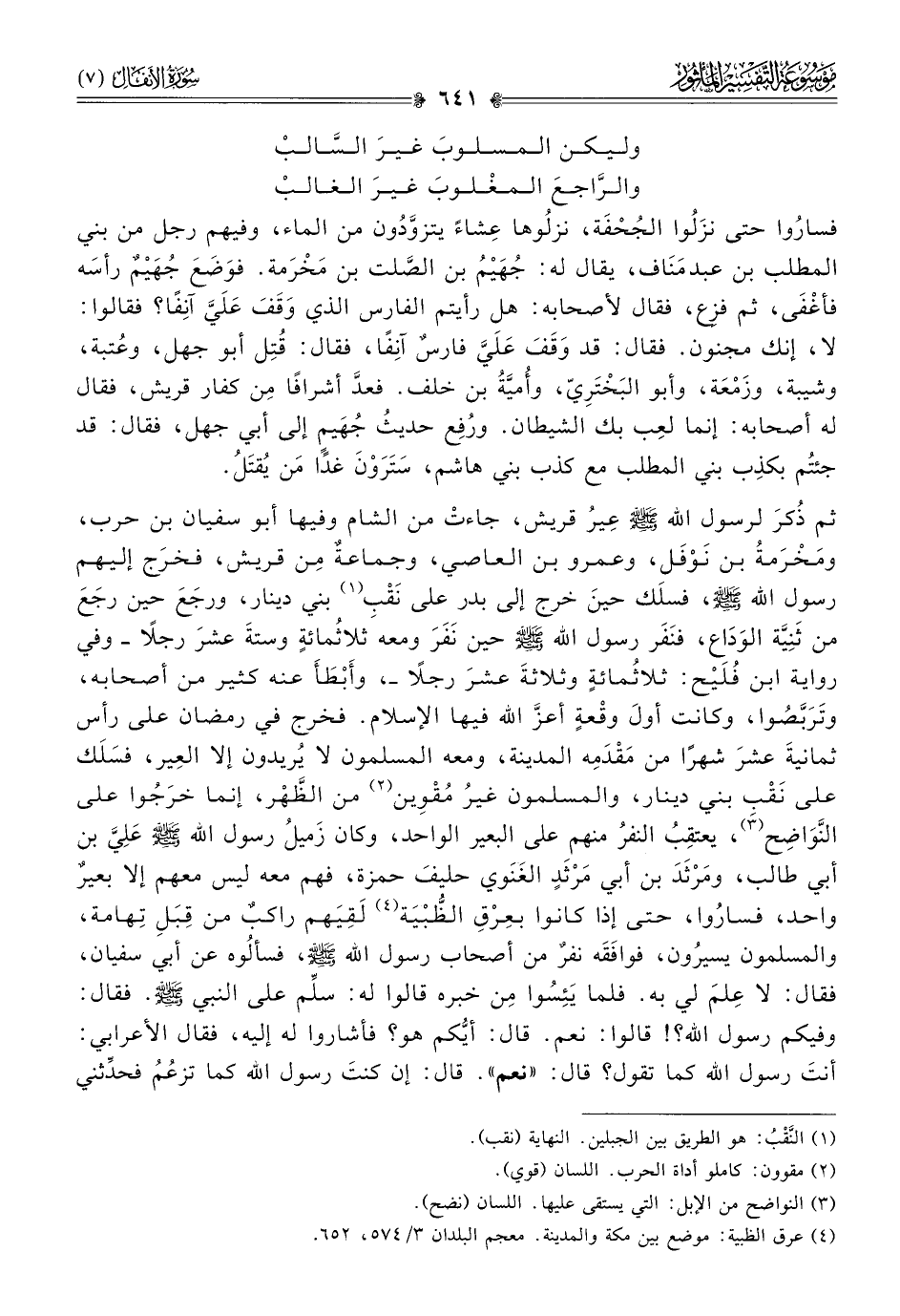 ثم ذُكرَ لرسول الله - صلى الله عليه وسلم - عِيرُ قريش، جاءتْ من الشام وفيها أبو سفيان بن حرب، ومَخْرَمةُ بن نَوْفَل، وعمرو بن العاصي، وجماعةٌ مِن قريش، فخرَج إليهم رسول الله - صلى الله عليه وسلم -، فسلَك حينَ خرج إلى بدر على نَقْبِ (¬١) بني دينار، ورجَعَ حين رجَعَ من ثَنِيَّة الوَداع، فنَفَر رسول الله - صلى الله عليه وسلم - حين نَفَرَ ومعه ثلاثُمائةٍ وستةَ عشرَ رجلًا -وفي رواية ابن فُلَيْح: ثلاثُمائةٍ وثلاثةَ عشرَ رجلًا-، وأَبْطَأَ عنه كثير من أصحابه، وتَرَبَّصُوا، وكانت أولَ وقْعةٍ أعزَّ الله فيها الإسلام. فخرج في رمضان على رأس ثمانيةَ عشرَ شهرًا من مَقْدَمِه المدينة، ومعه المسلمون لا يُريدون إلا العِير، فسَلَك على نَقْبِ بني دينار، والمسلمون غيرُ مُقْوِين (¬٢) من الظَّهْر، إنما خرَجُوا على النَّواضِح (¬٣)، يعتقِبُ النفرُ منهم على البعير الواحد، وكان زَميلُ رسول الله - صلى الله عليه وسلم - عَلِيَّ بن أبي طالب، ومَرْثَدَ بن أبي مَرْثَدٍ الغَنَوي حليفَ حمزة، فهم معه ليس معهم إلا بعيرٌ واحد، فسارُوا، حتى إذا كانوا بعِرْقِ الظُّبْيَة (¬٤) لَقِيَهم راكبٌ من قِبَلِ تِهامة، والمسلمون يسيرُون، فوافَقَه نفرٌ من أصحاب رسول الله - صلى الله عليه وسلم -، فسألُوه عن أبي سفيان، فقال: لا عِلمَ لي به. فلما يَئِسُوا مِن خبره قالوا له: سلِّم على النبي - صلى الله عليه وسلم -. فقال: وفيكم رسول الله؟! قالوا: نعم. قال: أيُّكم هو؟ فأشاروا له إليه، فقال الأعرابي: أنتَ رسول الله كما تقول؟ قال: «نعم». قال: إن كنتَ رسول الله كما تزعُمُ فحدِّثني