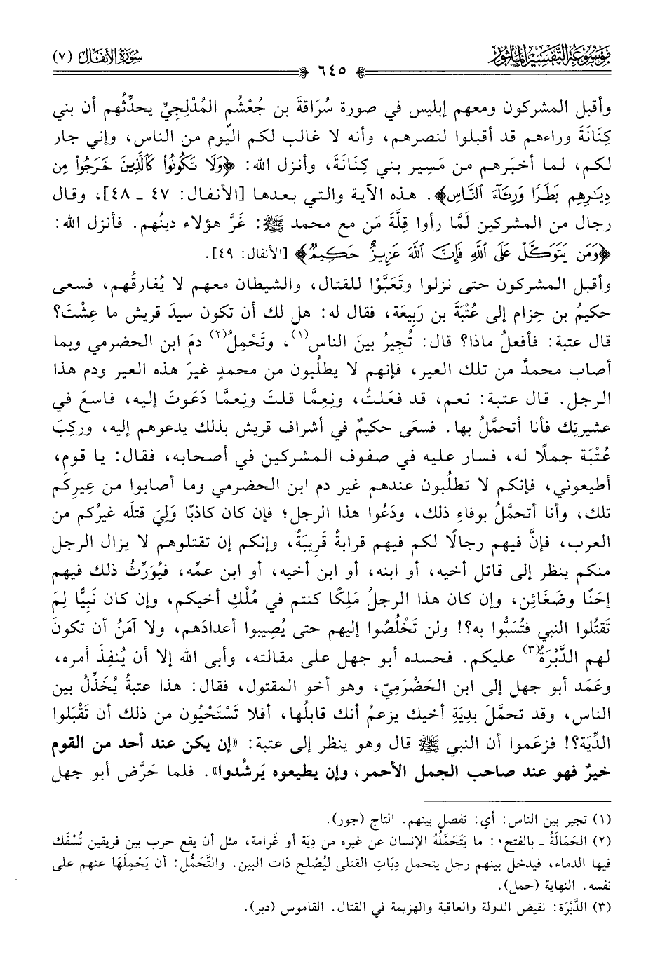 وأقبل المشركون حتى نزلوا وتَعَبَّوْا للقتال، والشيطان معهم لا يُفارقُهم، فسعى حكيمُ بن حِزام إلى عُتْبَةَ بن رَبِيعَة، فقال له: هل لك أن تكون سيدَ قريش ما عِشْتَ؟ قال عتبة: فأفعلُ ماذا؟ قال: تُجِيرُ بينَ الناس (¬١)، وتَحْمِلُ (¬٢) دمَ ابن الحضرمي وبما أصاب محمدٌ من تلك العير، فإنهم لا يطلُبون من محمدٍ غيرَ هذه العير ودم هذا الرجل. قال عتبة: نعم، قد فعَلتُ، ونِعِمّا قلتَ ونِعمّا دَعَوتَ إليه، فاسعَ في عشيرتِك فأنا أتحمَّلُ بها. فسعى حكيمٌ في أشراف قريش بذلك يدعوهم إليه، وركِبَ عُتْبَة جملًا له، فسار عليه في صفوف المشركين في أصحابه، فقال: يا قومِ، أطيعوني، فإنكم لا تطلُبون عندهم غير دم ابن الحضرمي وما أصابوا من عِيرِكم تلك، وأنا أتحمَّلُ بوفاءِ ذلك، ودَعُوا هذا الرجل؛ فإن كان كاذبًا ولِيَ قتلَه غيرُكم من العرب، فإنّ فيهم رجالًا لكم فيهم قرابةٌ قَرِيبَةٌ، وإنكم إن تقتلوهم لا يزال الرجل منكم ينظر إلى قاتل أخيه، أو ابنه، أو ابن أخيه، أو ابن عمِّه، فيُوَرِّثُ ذلك فيهم إحَنًا وضَغائِن، وإن كان هذا الرجلُ مَلِكًا كنتم في مُلْكِ أخيكم، وإن كان نَبِيًّا لِمَ تَقتُلوا النبي فتُسَبُّوا به؟! ولن تَخْلُصُوا إليهم حتى يُصِيبوا أعدادَهم، ولا آمَنُ أن تكونَ لهم الدَّبْرَةُ (¬٣) عليكم. فحسده أبو جهل على مقالته، وأبى الله إلا أن يُنفِذَ أمره، وعَمَد أبو جهل إلى ابن الحَضْرَمِيّ، وهو أخو المقتول، فقال: هذا عتبةُ يُخَذِّلُ بين الناس، وقد تحمَّلَ بدِيَةِ أخيك يزعمُ أنك قابلُها، أفلا تَسْتَحْيُون من ذلك أن تَقْبَلوا الدِّيَة؟! فزعَموا أن النبي - صلى الله عليه وسلم - قال وهو ينظر إلى عتبة: «إن يكن عند أحد من القوم خيرٌ فهو عند صاحب الجمل الأحمر، وإن يطيعوه يَرشُدوا». فلما حَرَّض أبو جهل