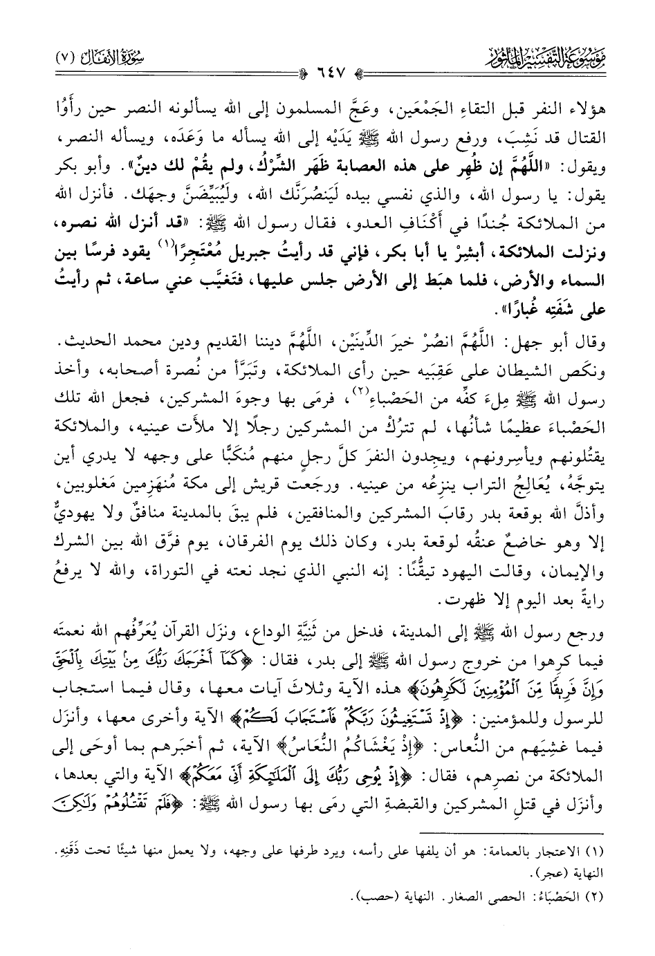 هؤلاء النفر قبل التقاءِ الجَمْعَين، وعَجَّ المسلمون إلى الله يسألونه النصر حين رأَوُا القتال قد نَشِبَ، ورفع رسول الله - صلى الله عليه وسلم - يَدَيْه إلى الله يسأله ما وعَدَه، ويسأله النصر، ويقول: «اللهمَّ إن ظُهِر على هذه العصابة ظَهَر الشِّرْكُ، ولم يقُمْ لك دينٌ». وأبو بكر يقول: يا رسول الله، والذي نفسي بيده لَيَنصُرَنَّك الله، ولَيُبَيِّضَنَّ وجهَك. فأنزل الله من الملائكة جُندًا في أكْنافِ العدو، فقال رسول الله - صلى الله عليه وسلم -: «قد أنزل الله نصره، ونزلت الملائكة، أبشِرْ يا أبا بكر، فإني قد رأيتُ جبريل مُعْتَجِرًا (¬١) يقود فرسًا بين السماء والأرض، فلما هبَط إلى الأرض جلس عليها، فتَغيَّب عني ساعة، ثم رأيتُ على شَفَتِه غُبارًا».