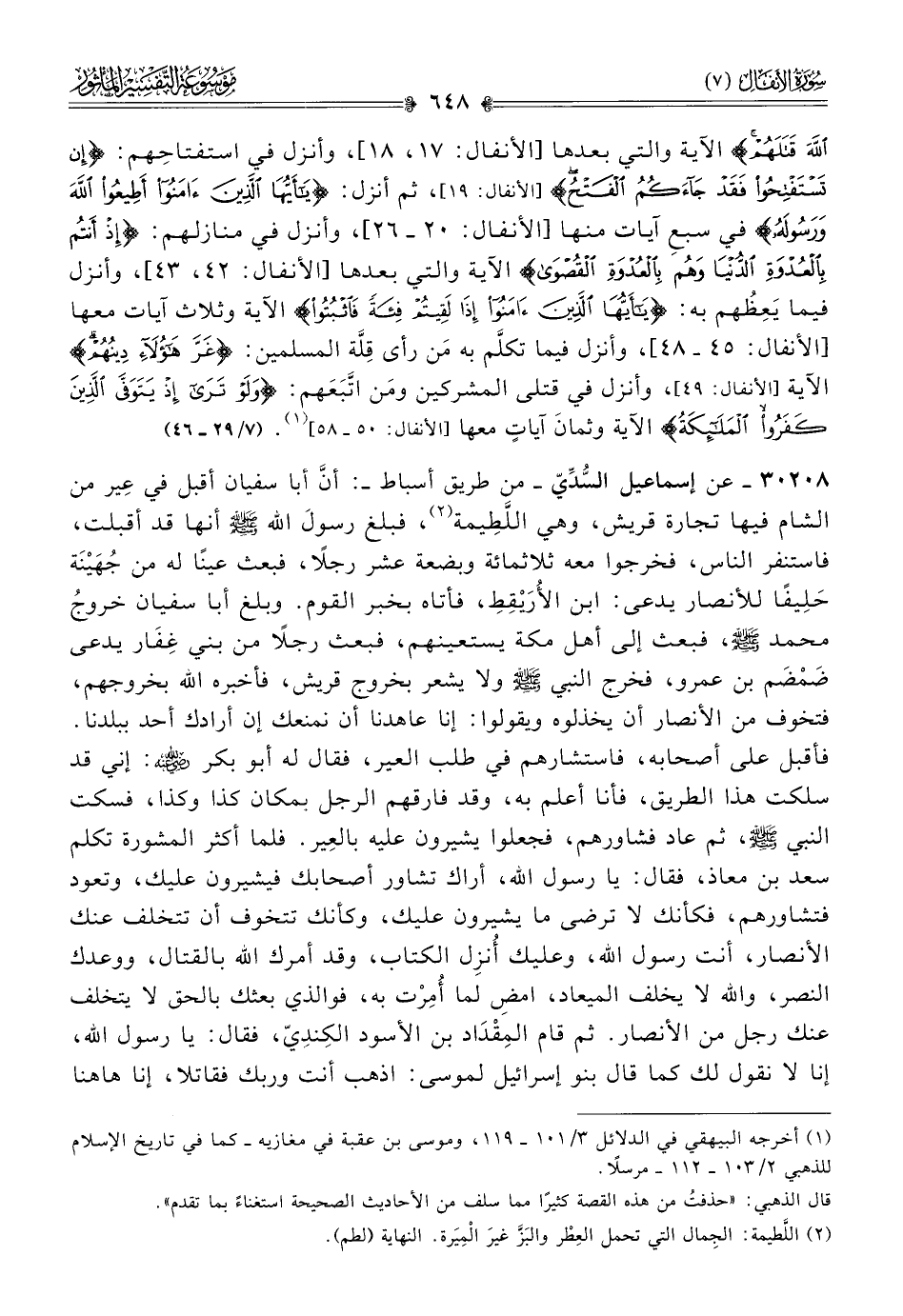 ٣٠٢٠٨ - عن إسماعيل السُّدِّيّ -من طريق أسباط-: أنّ أبا سفيان أقبل في عِير من الشام فيها تجارة قريش، وهي اللَّطِيمة (¬٢)، فبلغ رسولَ الله - صلى الله عليه وسلم - أنها قد أقبلت، فاستنفر الناس، فخرجوا معه ثلاثمائة وبضعة عشر رجلًا، فبعث عينًا له من جُهَيْنَة حَلِيفًا للأنصار يدعى: ابن الأُرَيْقِطِ، فأتاه بخبر القوم. وبلغ أبا سفيان خروجُ محمد - صلى الله عليه وسلم -، فبعث إلى أهل مكة يستعينهم، فبعث رجلًا من بني غِفار يدعى ضَمْضَم بن عمرو، فخرج النبي - صلى الله عليه وسلم - ولا يشعر بخروج قريش، فأخبره الله بخروجهم، فتخوف من الأنصار أن يخذلوه ويقولوا: إنا عاهدنا أن نمنعك إن أرادك أحد ببلدنا. فأقبل على أصحابه، فاستشارهم في طلب العير، فقال له أبو بكر?: إني قد سلكت هذا الطريق، فأنا أعلم به، وقد فارقهم الرجل بمكان كذا وكذا، فسكت النبي - صلى الله عليه وسلم -، ثم عاد فشاورهم، فجعلوا يشيرون عليه بالعِير. فلما أكثر المشورة تكلم سعد بن معاذ، فقال: يا رسول الله، أراك تشاور أصحابك فيشيرون عليك، وتعود فتشاورهم، فكأنك لا ترضى ما يشيرون عليك، وكأنك تتخوف أن تتخلف عنك الأنصار، أنت رسول الله، وعليك أُنزِل الكتاب، وقد أمرك الله بالقتال، ووعدك النصر، والله لا يخلف الميعاد، امضِ لما أُمِرْت به، فوالذي بعثك بالحق لا يتخلف عنك رجل من الأنصار. ثم قام المِقْداد بن الأسود الكِندِيّ، فقال: يا رسول الله، إنا لا نقول لك كما قال بنو إسرائيل لموسى: اذهب أنت وربك فقاتلا، إنا هاهنا