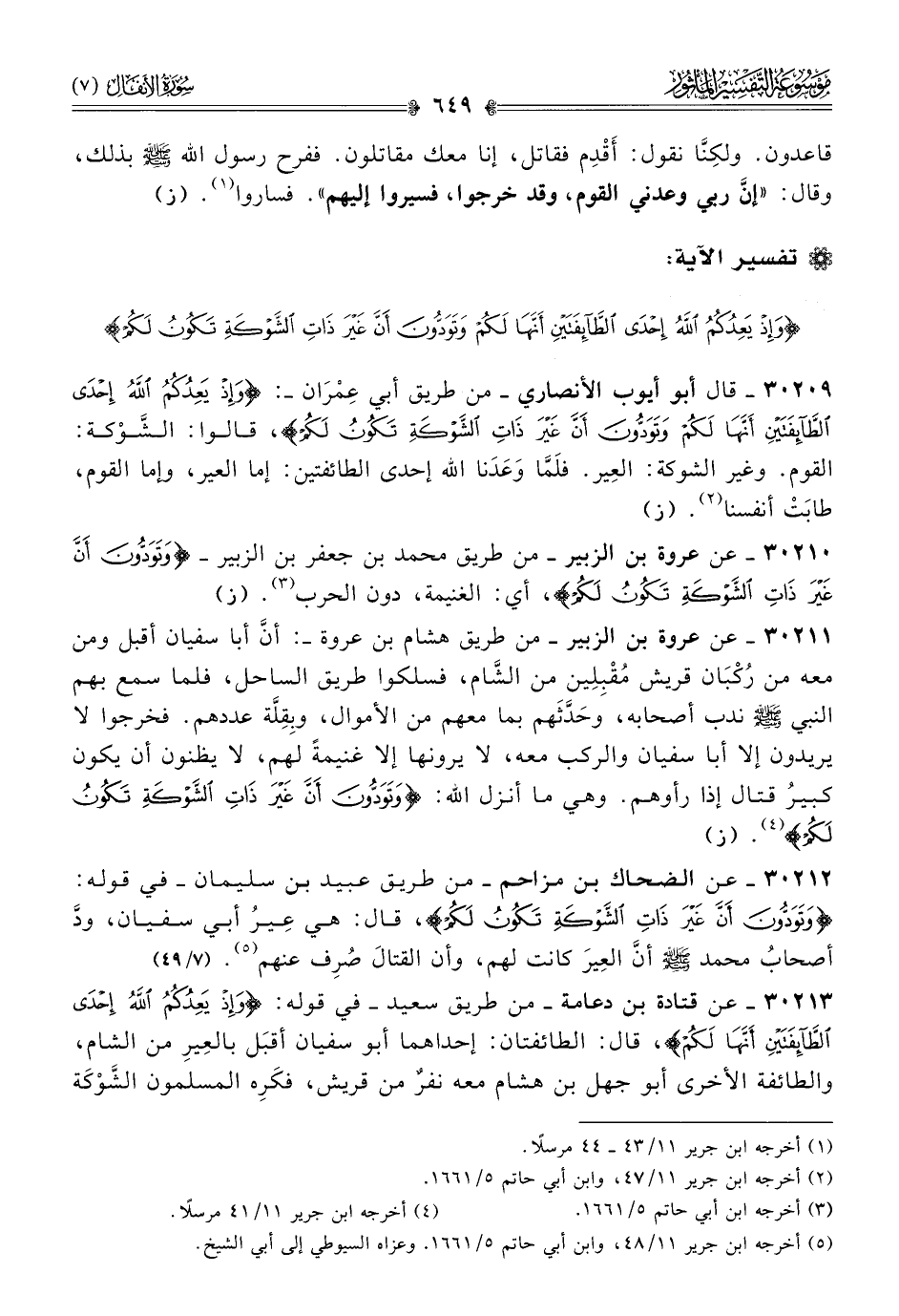 ٣٠٢٠٩ - قال أبو أيوب الأنصاري -من طريق أبي عِمْران-: {وإذ يعدكم الله إحدى الطائفتين أنها لكم وتودون أن غير ذات الشوكة تكون لكم}، قالوا: الشَّوْكة: القوم. وغير الشوكة: العِير. فلَمّا وعَدَنا الله إحدى الطائفتين: إما العير، وإما القوم، طابَتْ أنفسنا (¬٢). (ز)