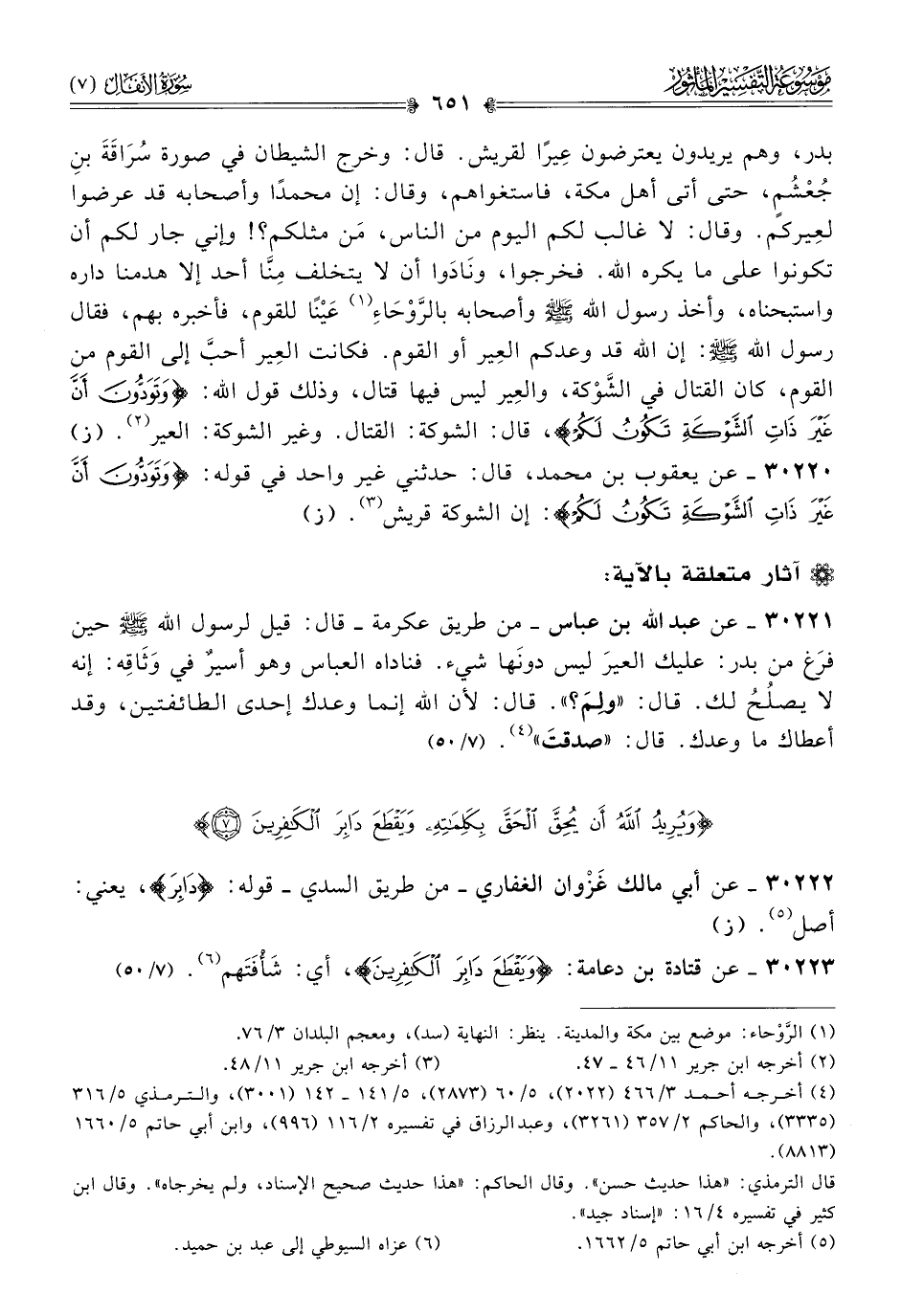 بدر، وهم يريدون يعترضون عِيرًا لقريش. قال: وخرج الشيطان في صورة سُراقَةَ بنِ جُعْشُمٍ، حتى أتى أهل مكة، فاستغواهم، وقال: إن محمدًا وأصحابه قد عرضوا لعِيركم. وقال: لا غالب لكم اليوم من الناس، مَن مثلكم؟! وإني جار لكم أن تكونوا على ما يكره الله. فخرجوا، ونادَوا أن لا يتخلف مِنّا أحد إلا هدمنا داره واستبحناه، وأخذ رسول الله - صلى الله عليه وسلم - وأصحابه بالرَّوْحاءِ (¬١) عَيْنًا للقوم، فأخبره بهم، فقال رسول الله - صلى الله عليه وسلم -: إن الله قد وعدكم العِير أو القوم. فكانت العِير أحبَّ إلى القوم من القوم، كان القتال في الشَّوْكة، والعِير ليس فيها قتال، وذلك قول الله: {وتودون أن غير ذات الشوكة تكون لكم}، قال: الشوكة: القتال. وغير الشوكة: العير (¬٢). (ز)