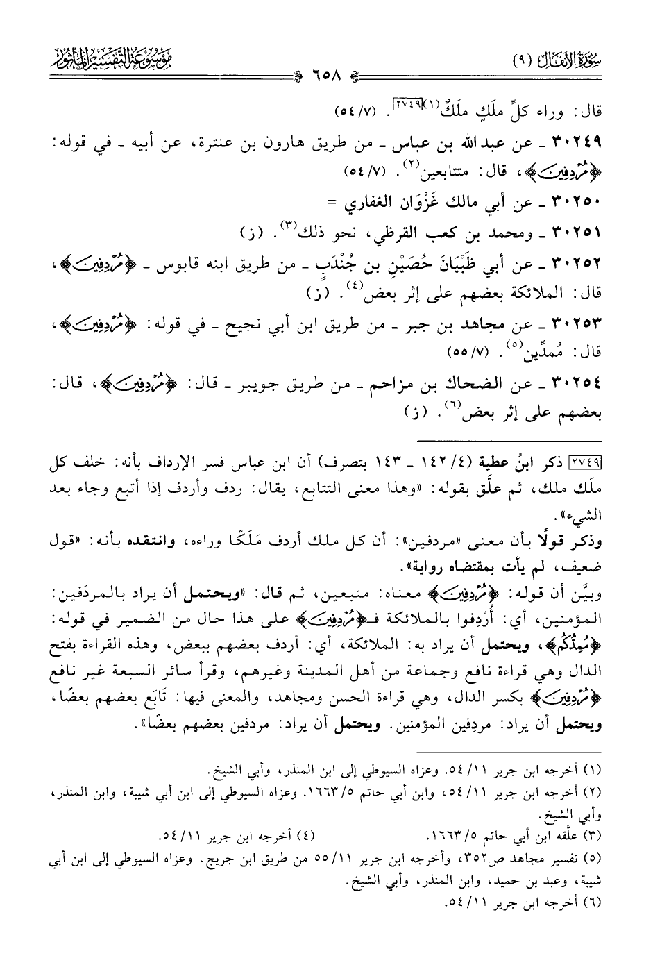 [٢٧٤٩] ذكر ابنُ عطية (٤/ ١٤٢ - ١٤٣ بتصرف) أن ابن عباس فسر الإرداف بأنه: خلف كل ملَك ملك، ثم علَّق بقوله: «وهذا معنى التتابع، يقال: ردف وأردف إذا أتبع وجاء بعد الشيء».وذكر قولًا بأن معنى «مردفين»: أن كل ملك أردف مَلَكًا وراءه، وانتقده بأنه: «قول ضعيف، لم يأت بمقتضاه رواية».