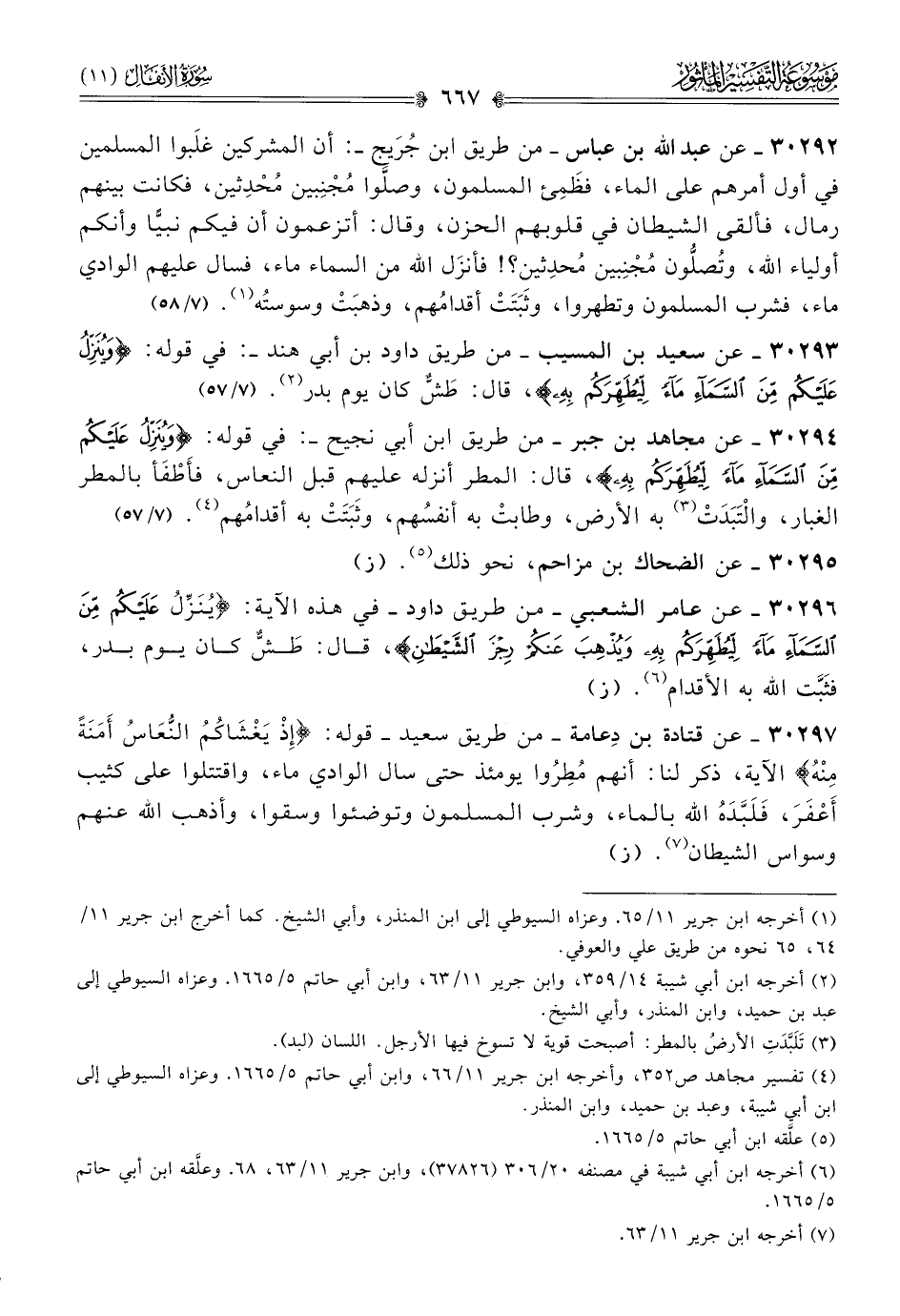 ٣٠٢٩٢ - عن عبد الله بن عباس -من طريق ابن جُرَيج-: أن المشركين غلَبوا المسلمين في أول أمرهم على الماء، فظَمِئ المسلمون، وصلَّوا مُجْنِبين مُحْدِثين، فكانت بينهم رمال، فألقى الشيطان في قلوبهم الحزن، وقال: أتزعمون أن فيكم نبيًّا وأنكم أولياء الله، وتُصلُّون مُجْنِبين مُحدِثين؟! فأنزَل الله من السماء ماء، فسال عليهم الوادي ماء، فشرب المسلمون وتطهروا، وثَبَتَتْ أقدامُهم، وذهبَتْ وسوستُه (¬١). (٧/ ٥٨)
