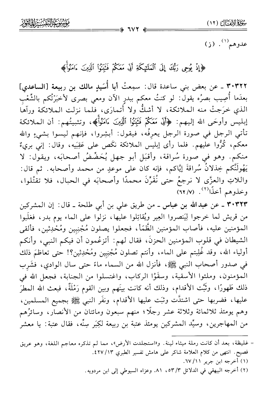 ٣٠٣٢٣ - عن عبد الله بن عباس -من طريق علي بن أبي طلحة- قال: إن المشركين من قريش لما خرجوا لِيَنصروا العِير ويُقاتِلوا عليها، نزلوا على الماء يوم بدر، فغلَبوا المؤمنين عليه، فأصاب المؤمنين الظَّمَأ، فجعلوا يصلون مُجْنِبِين ومُحْدِثين، فألقى الشيطان في قلوب المؤمنين الحزنَ، فقال لهم: أتزعُمون أن فيكم النبي، وأنكم أولياء الله، وقد غُلِبتم على الماء، وأنتم تصلون مُجْنِبِين ومُحْدِثين؟! حتى تعاظمَ ذلك في صدور أصحاب النبي - صلى الله عليه وسلم -، فأنزل الله من السماء ماءً حتى سال الوادي، فشَرِب المؤمنون، وملئوا الأسقية، وسقَوُا الركاب، واغتسلوا من الجنابة، فجعل الله في ذلك طَهورًا، وثَبَّت الأقدام، وذلك أنه كانت بينَهم وبين القوم رَمْلَةٌ، فبعث الله المطرَ عليها، فضربها حتى اشتدَّت وثبَت عليها الأقدام، ونفَر النبي - صلى الله عليه وسلم - بجميع المسلمين، وهم يومئذ ثلاثمائة وثلاثة عشر رجلًا؛ منهم سبعون ومائتان من الأنصار، وسائرُهم من المهاجرين، وسيِّد المشركين يومئذ عتبة بن ربيعة لكِبَر سِنِّه، فقال عتبة: يا معشر