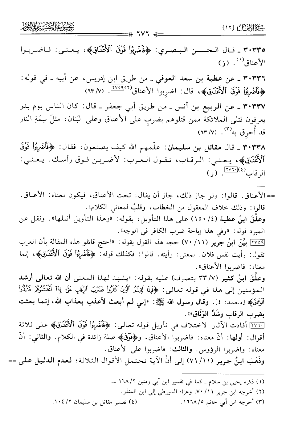 ٣٠٣٣٥ - قال الحسن البصري: {فاضربوا فوق الأعناق}، يعني: فاضربوا الأعناق (¬١). (ز)
