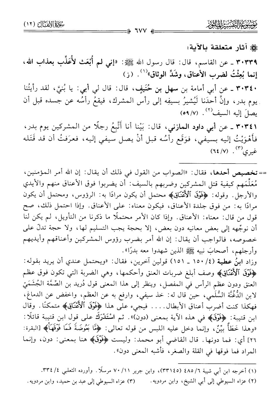 ٣٠٣٤٠ - عن أبي أمامة بن سهل بن حُنَيفٍ، قال: قال لي أبي: يا بُنيَّ، لقد رأيتُنا يوم بدر، وإنّ أحدَنا لَيُشيرُ بسيفِه إلى رأس المشرك، فيقعُ رأسُه عن جسده قبل أن يصلَ إليه السيف (¬٢). (٧/ ٥٩)