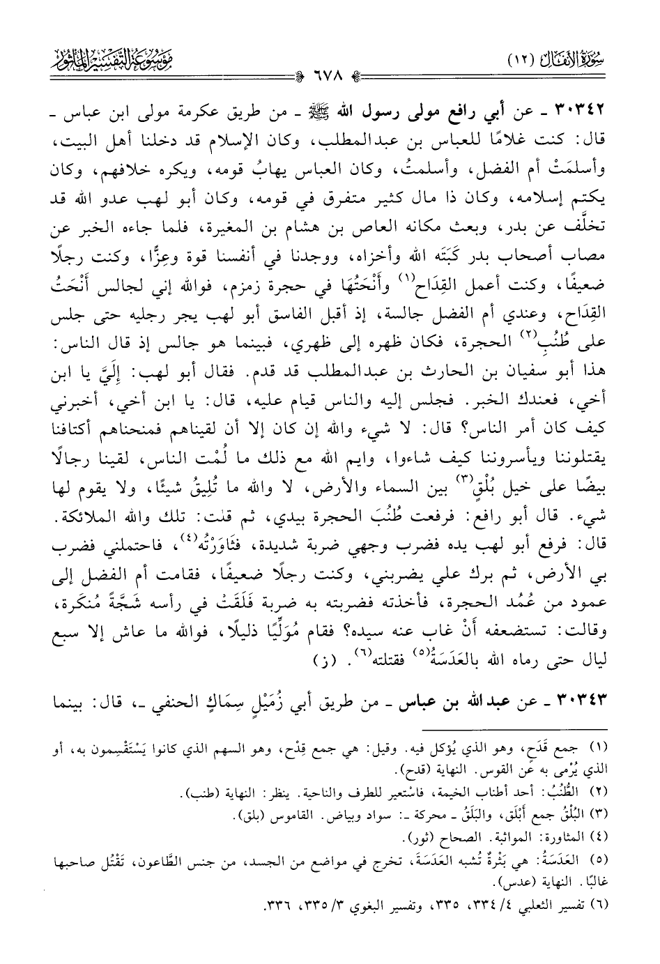 ٣٠٣٤٢ - عن أبي رافع مولى رسول الله - صلى الله عليه وسلم - -من طريق عكرمة مولى ابن عباس- قال: كنت غلامًا للعباس بن عبد المطلب، وكان الإسلام قد دخلنا أهل البيت، وأسلمَتْ أم الفضل، وأسلمتُ، وكان العباس يهابُ قومه، ويكره خلافهم، وكان يكتم إسلامه، وكان ذا مال كثير متفرق في قومه، وكان أبو لهب عدو الله قد تخلَّف عن بدر، وبعث مكانه العاص بن هشام بن المغيرة، فلما جاءه الخبر عن مصاب أصحاب بدر كَبَتَه الله وأخزاه، ووجدنا في أنفسنا قوة وعِزًّا، وكنت رجلًا ضعيفًا، وكنت أعمل القِداح (¬١) وأَنْحَتُها في حجرة زمزم، فوالله إني لجالس أنْحَتُ القِداح، وعندي أم الفضل جالسة، إذ أقبل الفاسق أبو لهب يجر رجليه حتى جلس على طُنُبِ (¬٢) الحجرة، فكان ظهره إلى ظهري، فبينما هو جالس إذ قال الناس: هذا أبو سفيان بن الحارث بن عبد المطلب قد قدم. فقال أبو لهب: إلَيَّ يا ابن أخي، فعندك الخبر. فجلس إليه والناس قيام عليه، قال: يا ابن أخي، أخبرني كيف كان أمر الناس؟ قال: لا شيء والله إن كان إلا أن لقيناهم فمنحناهم أكتافنا يقتلوننا ويأسروننا كيف شاءوا، وايم الله مع ذلك ما لُمْت الناس، لقينا رجالًا بيضًا على خيل بُلْقٍ (¬٣) بين السماء والأرض، لا والله ما تُلِيقُ شيئًا، ولا يقوم لها شيء. قال أبو رافع: فرفعت طُنُبَ الحجرة بيدي، ثم قلت: تلك والله الملائكة. قال: فرفع أبو لهب يده فضرب وجهي ضربة شديدة، فثاوَرْتُه (¬٤)، فاحتملني فضرب بي الأرض، ثم برك علي يضربني، وكنت رجلًا ضعيفًا، فقامت أم الفضل إلى عمود من عُمُد الحجرة، فأخذته فضربته به ضربة فَلَقَتْ في رأسه شَجَّةً مُنكَرة، وقالت: تستضعفه أنْ غاب عنه سيده؟ فقام مُوَلِّيًا ذليلًا، فوالله ما عاش إلا سبع ليال حتى رماه الله بالعَدَسَةُ (¬٥) فقتلته (¬٦). (ز)