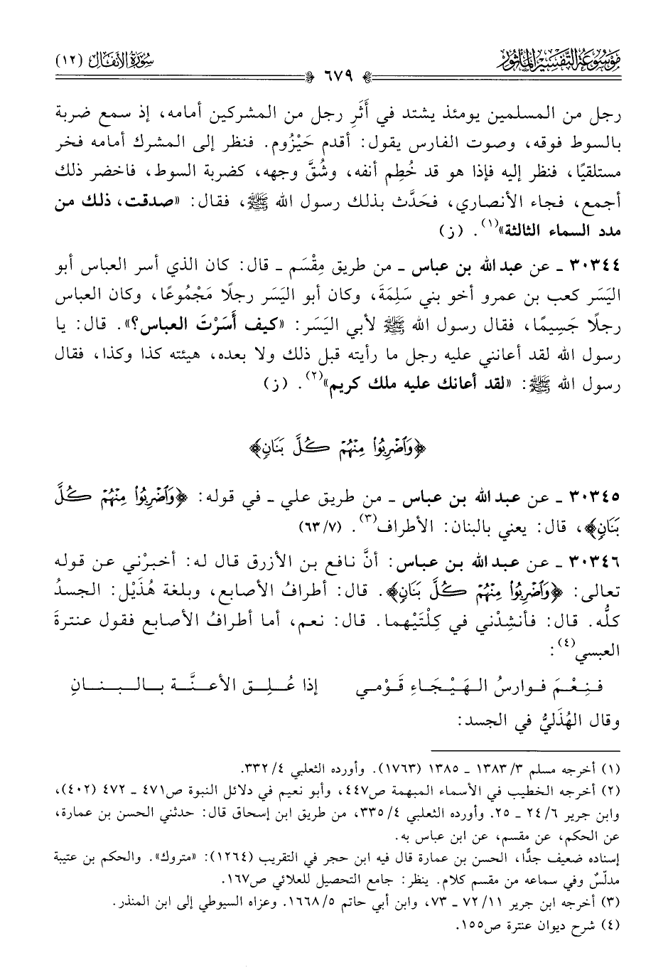 ٣٠٣٤٦ - عن عبد الله بن عباس: أنّ نافع بن الأزرق قال له: أخبرْني عن قوله تعالى: {واضربوا منهم كل بنان}. قال: أطرافُ الأصابع، وبلغة هُذَيْل: الجسدُ كلُّه. قال: فأنشِدْني في كِلْتَيْهما. قال: نعم، أما أطرافُ الأصابع فقول عنترةَ العبسي (¬٤):