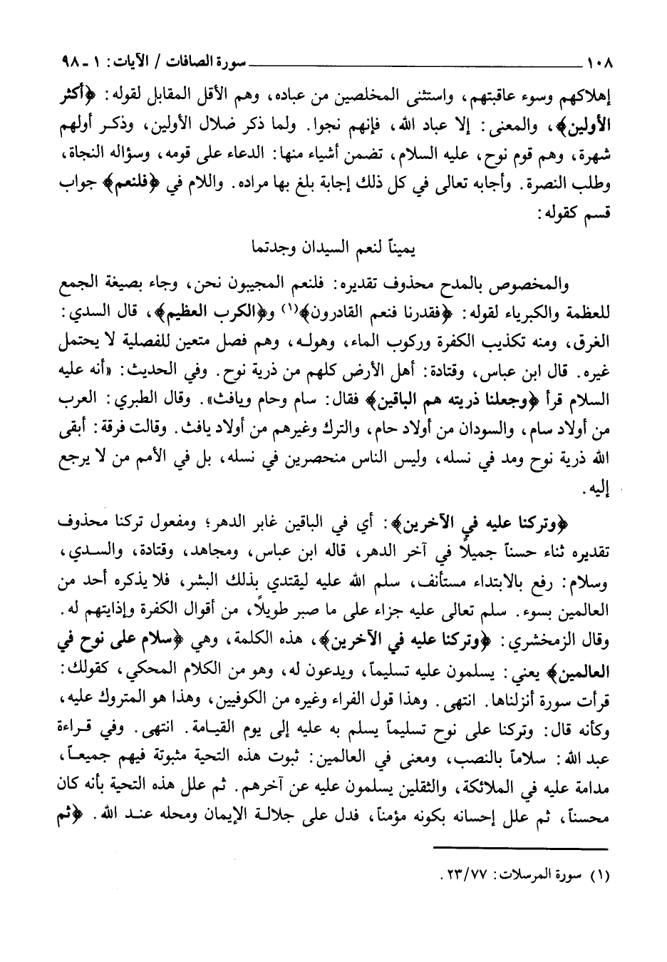 قَرَأْتُ سُورَةً أَنْزَلْنَاهَا. انْتَهَى. وَهَذَا قَوْلُ الْفَرَّاءِ وَغَيْرِهِ مِنَ الْكُوفِيِّينَ، وَهَذَا هُوَ الْمَتْرُوكُ عَلَيْهِ، وَكَأَنَّهُ قَالَ: وَتَرَكْنَا عَلَى نُوحٍ تَسْلِيمًا يُسَلَّمُ بِهِ عَلَيْهِ إِلَى يَوْمِ الْقِيَامَةِ. انْتَهَى. وَفِي قِرَاءَةِ عَبْدِ اللَّهِ: سَلَامًا بِالنَّصْبِ، وَمَعْنَى فِي الْعَالَمِينَ: ثُبُوتُ هَذِهِ التَّحِيَّةِ مَثْبُوتَةً فِيهِمْ جَمِيعًا، مُدَامَةٌ عَلَيْهِ فِي الْمَلَائِكَةِ، وَالثَّقَلَيْنِ يُسَلِّمُونَ عَلَيْهِ عَنْ آخِرِهِمْ. ثُمَّ عَلَّلَ هَذِهِ التَّحِيَّةَ بِأَنَّهُ كَانَ مُحْسِنًا، ثُمَّ عَلَّلَ إِحْسَانَهُ بِكَوْنِهِ مُؤْمِنًا، فَدَلَّ عَلَى جَلَالَةِ الْإِيمَانِ ومحله عند الله.